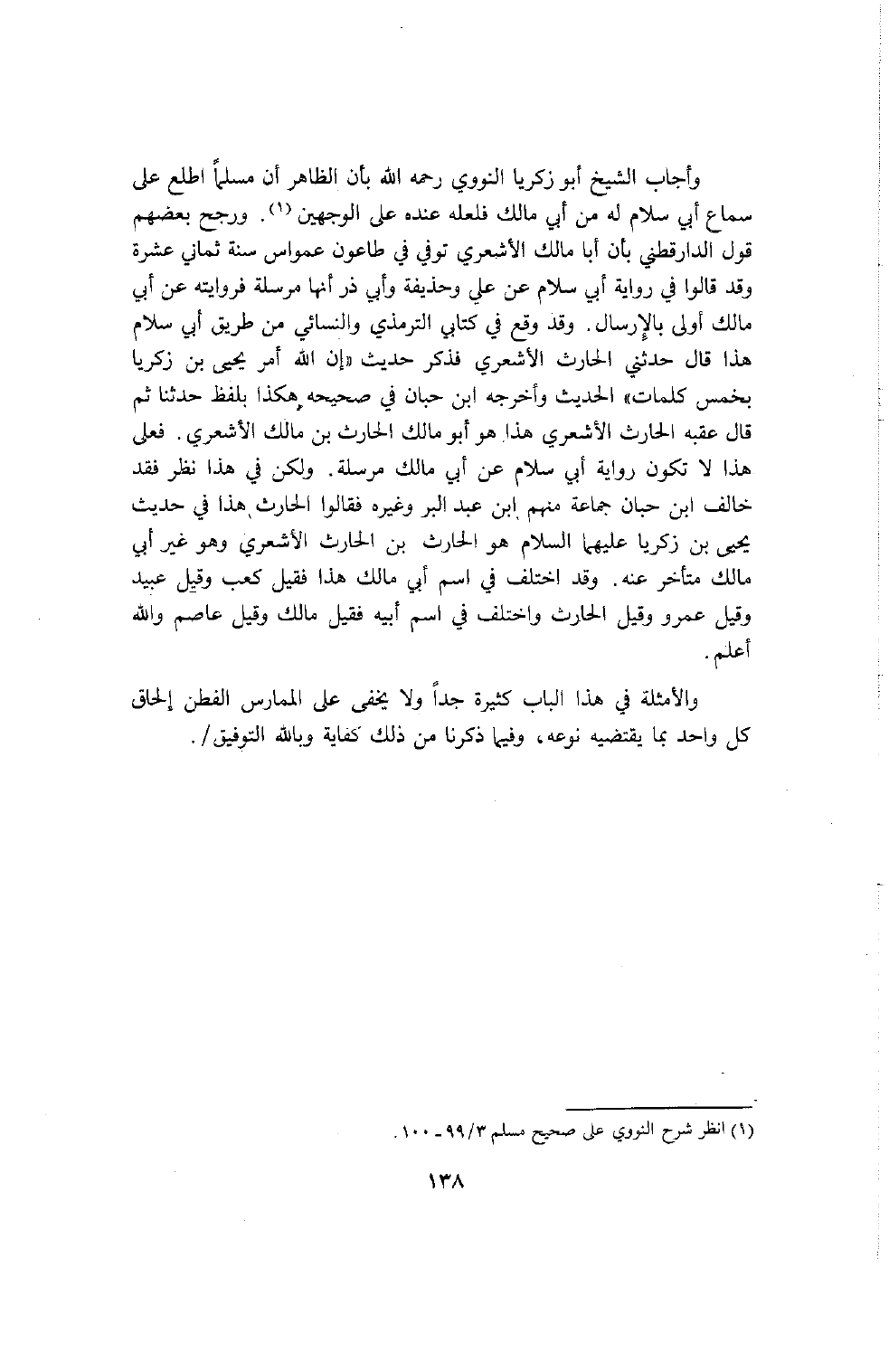 وأجاب الشيخ أبو زكريا النووي رحمه الله بأن الظاهر أن مسلما اطلع على سماع أبي سلام له من أبي مالك فلعله عنده على الوجهين ورجح بعضهم قول الدارقطني بأن أبا مالك الأشعري توفي في طاعون عمواس سنة ثماني عشرة وقد قالوا في رواية أبي سلام عن علي وحذيفة وأبي ذر أنها مرسلة فروايته عن أبي مالك أولى بالإرسال وقد وقع في كتابي الترمذي والنسائي من طريق أبي سلام هذا قال حدثني الحارث الأشعري فذكر حديث إن الله أمر يحيى بن زكريا بخمس كلمات الحديث وأخرجه ابن حيان في صحيحه هكذا بلفظ حدثنا ثم قال عقبة الحارث الأشعري هذا هو أبو مالك الحارث بن مالك الأشعري فعلى هذا لا تكون رواية أبي سلام عن أبي مالك مرسلة ولكن في هذا نظر فقد خالف ابن حبان جماعة منهم ابن عبد البر وغيره فقالوا الحارث هذا في حديث يحيى بن زكريا عليهما السلام هو الحارث بن الحارث الأشعري وهو غير أبي مالك متأخر عنه وقد اختلف في اسم ابي مالك هذا فقيل كعب قيل عبيد وقيل عمرو وقيل الحارث واختلف في اسم أبيه فقيل مالك وقيل عاصم والله أعلم