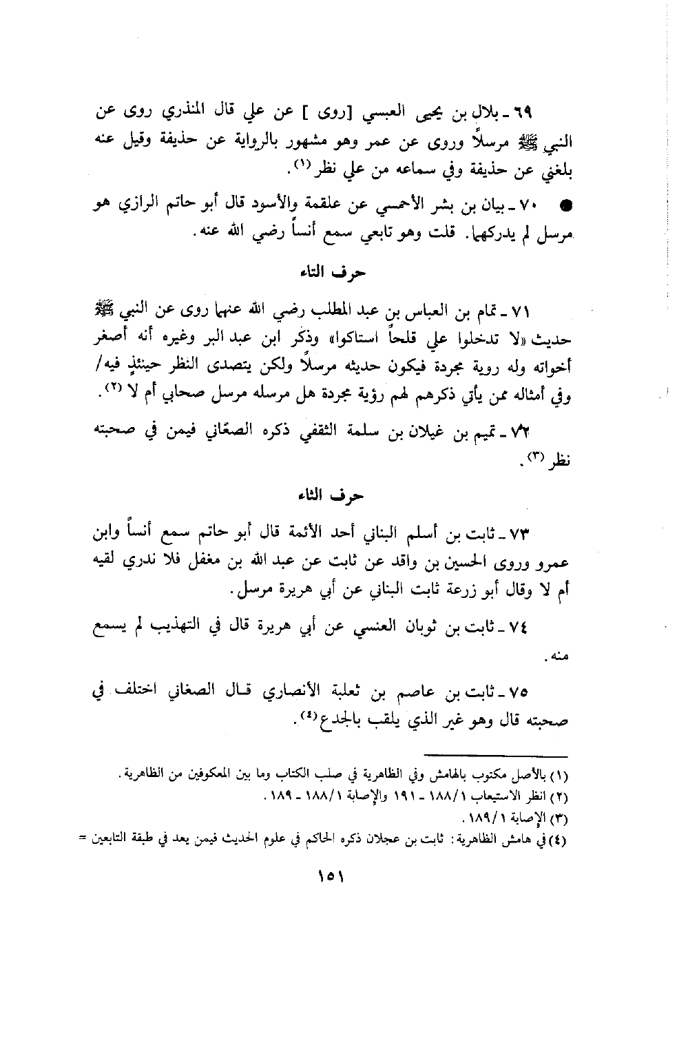 73 - ثابت بن أسلم البناني أحد الأئمة قال أبو حاتم سمع أناسا وابن عمرو وروى الحسين بن واقد عن ثابت عن عبد الله بن مغفل فلا ندري لقيه أم لا وقال أبو زرعة ثابت البناني عن أبي هريرة مرسل