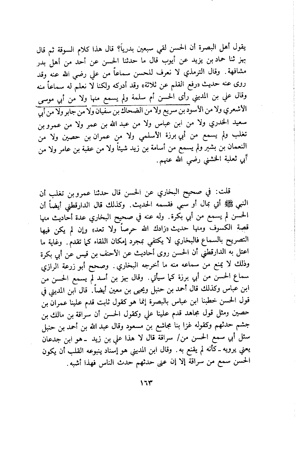 يقول أهل البصرة أن الحسن لقي سبعين بدريا قال هذا كلام السوقة ثم قال بهز ثنا حماد بن يزيد عن أيوب قال ما حدثنا الحسن عن أحد من أهل بدر مشافهة وقال الترمذي لا نعرف للحسن سماعا من علي رضي الله عنه وقد روى عنه حديث رفع القلم عن ثلاثة وقد أدركه ولكنا لا نعلم له سماعا منه وقال علي بن المديني رأى الحسن أم سلمة ولم يسمع منها ولا من أبي موسى الأشعري ولا من الأسود بن سريع ولا من الضحاك بن سفيان ولا من جابر ولا من أبي سعيد الخدري ولا من بن عباس ولا من عبد الله بن عمر ولا من عمرو بن تغلب ولم يسمع من أبي برزة الأسلمي ولا من عمران بن حصين ولا من النعمان بن بشير ولم يسمع من أسامة بن زيد شيئا ولا من عقبة بن عامر ولا من أبي ثعلبة الخشني رضي الله عنهم قلت في صحيح البخاري عن الحسن قال حدثنا عمرو بن تغلب أن النبي صلى الله عليه وسلم أتي بمال أو سبي فقسمه الحديث وكذلك قال الدارقطني أيضا أن الحسن لم يسمع من أبي بكرة وله عنه في صحيح البخاري عدة أحاديث منها قصة الكسوف ومنها حديث زادك الله حرصا ولا تعد وأن لم يكن فيها التصريح بالسماع فالبخاري لا يكتفي بمجرد إمكان اللقاء كما تقدم وغاية ما اعتل به الدارقطني أن الحسن روى أحاديث عن الأحنف بن قيس عن أبي بكرة وذلك لا يمنع من سماعه منه ما أخرجه البخاري وصحح أبو زرعة الرازي سماع الحسن من أبي برزة كما سيأتي وقال بهز بن أسد لم يسمع الحسن من بن عباس وكذلك قال أحمد بن حنبل ويحيى بن معين أيضا قال بن المديني في قول الحسن خطبنا بن عباس بالبصرة إنما هو كقول ثابت قدم علينا عمران بن حصين ومثل قول مجاهد قدم علينا علي وكقول الحسن أن سراقة بن مالك بن جشم حدثهم وكقوله غزا بنا مجاشع بن مسعود وقال عبد الله بن أحمد بن حنبل سئل أبي سمع الحسن من سراقة قال لا هذا علي بن زيد هو بن جدعان يعني يرويه كأنه لم يقنع به وقال بن المديني هو إسناد ينبوعه القلب أن يكون الحسن سمع من سراقة إلا إن عني حدثهم حدث الناس فهذا أشبه