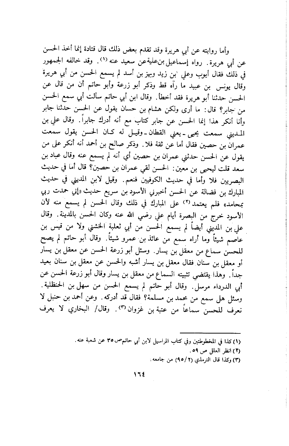 وأما روايته عن أبي هريرة وقد تقدم بعض ذلك قال قتادة إنما أخذ الحسن عن أبي هريرة رواه إسماعيل بن علية عن سعيد عنه وقد خالفه الجمهور في ذلك فقال أيوب وعلي بن زيد وبهز بن أسد لم يسمع الحسن من أبي هريرة وقال يونس بن عبيد ما رآه قط وذكر أبو زرعة وأبو حاتم أن من قال عن الحسن حدثنا أبو هريرة فقد أخطأ وقال بن أبي حاتم سألت أبي سمع الحسن من جابر قال ما أرى ولكن هشام بن حسان يقول عن الحسن حدثنا جابر وأنا أنكر هذا إنما الحسن عن جابر كتاب مع أنه أدرك جابرا وقال علي بن المديني سمعت يحيى يعني القطان وقيل له كان الحسن يقول سمعت عمران بن حصين فقال أما عن ثقة فلا وذكر صالح بن أحمد أنه أنكر على من يقول عن الحسن حدثني عمران بن حصين أي أنه لم يسمع عنه وقال عباد بن سعد قلت ليحيى بن معين الحسن لقي عمران بن حصين قال أما في حديث البصريين فلا وأما في حديث الكوفيين فنعم وقيل لابن المديني في حديث المبارك بن فضالة عن الحسن أخبرني الأسود بن سريع حديث إني حمدت ربي بمحامد فلم يعتمد على المبارك في ذلك وقال الحسن لم يسمع منه لأن الأسود خرج من البصرة أيام علي رضي الله عنه وكان الحسن بالمدينة وقال علي بن المديني أيضا لم يسمع الحسن من أبي ثعلبة الخشني ولا من قيس بن عاصم شيئا وما أراه سمع من عائذ بن عمرو شيئا وقال أبو حاتم لم يصح للحسن سماع من معقل بن يسار وسئل أبو زرعة الحسن عن معقل بن يسار أو معقل بن سنان فقال معقل بن يسار أشبه والحسن عن معقل بن سنان بعيد جدا وهذا يقتضي تثبيته السماع من معقل بن يسار وقال أبو زرعة الحسن عن أبي الدرداء مرسل وقال أبو حاتم لم يسمع الحسن من سهل بن الحنظلية وسئل هل سمع من محمد بن مسلمة فقال قد أدركه وعن أحمد بن حنبل لا نعرف للحسن سماعا من عتبة بن غزوان وقال البخاري لا يعرف