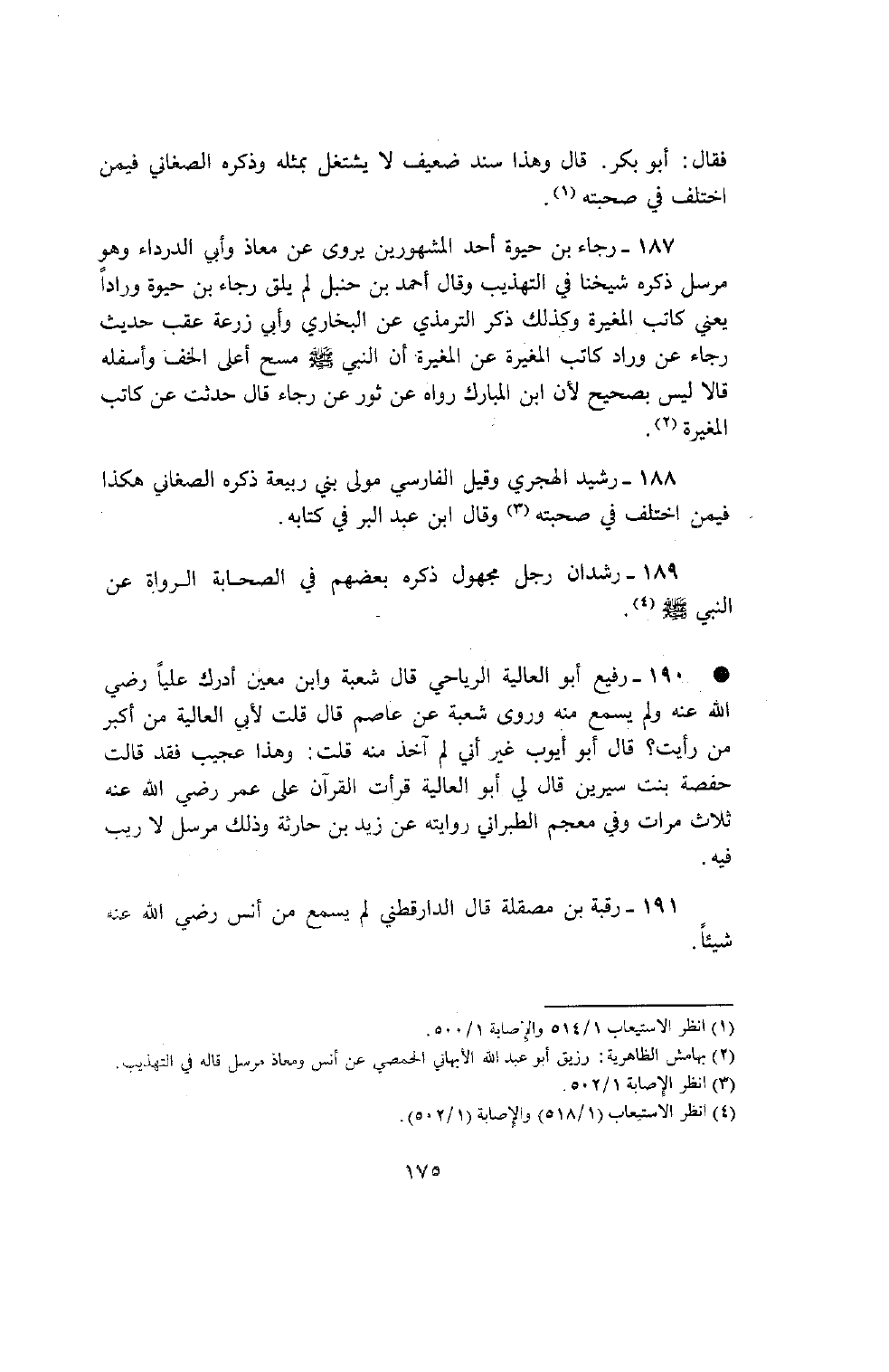 187 - رجاء بن حيوة أحد المشهورين يروي عن معاذ وأبي الدرداء وهو مرسل ذكره شيخنا في التهذيب وقال أحمد بن حنبل لم يلق رجاء بن حيوة ورادا يعني كاتب المغيرة وكذلك ذكر الترمذي عن البخاري وأبي زرعة عقب حديث رجاء عن وراد كاتب المغيرة عن المغيرة أن النبي صلى الله عليه وسلم مسح أعلى الخف وأسفله قالا ليس بصحيح لأن بن مبارك رواه عن ثور عن رجاء قال حدثت عن كاتب المغيرة