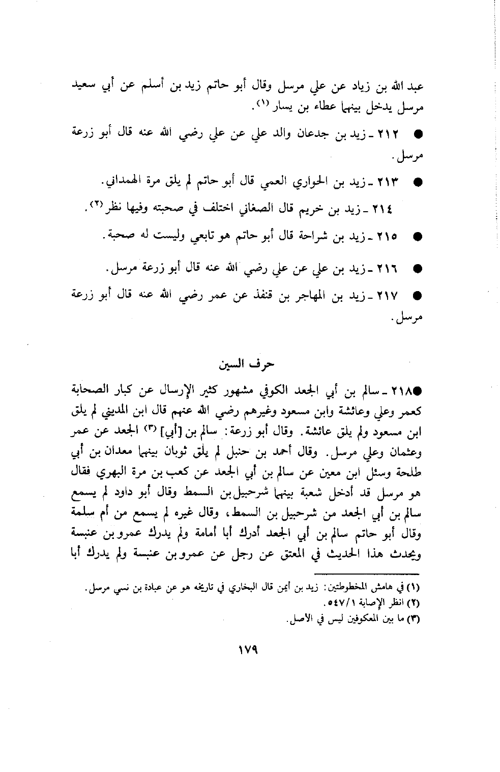 218 - سالم بن أبي الجعد الكوفي مشهور كثير الإرسال عن كبار الصحابة كعمر وعلي وعائشة وابن مسعود وغيرهم رضي الله عنهم قال بن المديني لم يلق بن مسعود ولم يلق عائشة وقال أبو زرعة سالم بن أبي الجعد عن عمر وعثمان وعلي مرسل وقال أحمد بن حنبل لم يلق ثوبان بينهما معدان بن أبي طلحة وسئل بن معين عن سالم بن أبي الجعد عن كعب بن مرة البهري فقال هو مرسل قد أدخل شعبة بينهما شرحبيل بن السمط وقال أبو داود لم يسمع سالم بن أبي الجعد من شرحبيل بن السمط وقال غيره لم يسمع من أم سلمة وقال أبو حاتم سالم بن أبي الجعد أدرك أبا أمامة ولم يدرك عمرو بن عنبسة ويحدث هذا الحديث في المعتق عن رجل عن عمرو بن عنبسة ولم يدرك أبا الدرداء ولم يدرك ثوبان وحكى الترمذي في العلل عن البخاري أنه قال سالم بن أبي الجعد لم يسمع من أبي أمامة ولا ثوبان وسمع من جابر وأنس بن مالك رضي الله عنهم وروى سالم بن أبي الجعد عن جابان عن عبد الله بن عمرو حديث لا يدخل الجنة منان وقيل أنه سالم عن نبيط عن جابان