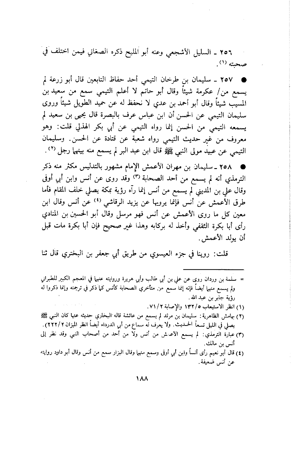 257 - سليمان بن طرخان التيمي أحد حفاظ التابعين قال أبو زرعة لم يسمع من عكرمة شيئا وقال أبو حاتم لا أعلم التيمي سمع من سعيد بن المسيب شيئا وقال أبو أحمد بن عدي لا نحفظ له عن حميد الطويل شيئا وروى سليمان التيمي عن الحسن أن بن عباس عرف بالبصرة قال يحيى بن سعيد لم يسمعه التيمي من الحسن إنما رواه التيمي عن أبي بكر الهذلي قلت وهو معروف من غير حديث التيمي رواه شعبة عن قتادة عن الحسن وسليمان التيمي عن عبيد مولى النبي صلى الله عليه وسلم قال بن عبد البر لم يسمع منه بينهما رجل