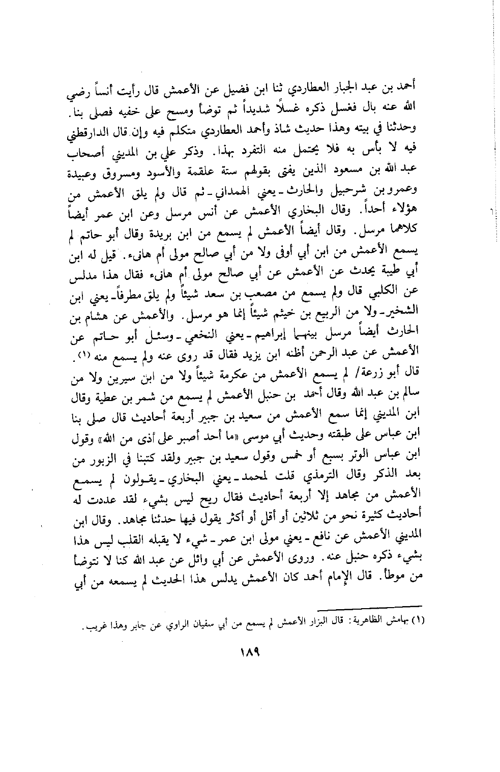 أحمد بن عبد الجبار العطاردي ثنا بن فضيل عن الأعمش قال رأيت أنسا رضي الله عنه بال فغسل ذكره غسلا شديدا ثم توضأ ومسح على خفيه فصلى بنا وحدثنا في بيته وهذا حديث شاذ وأحمد العطاردي متكلم فيه وإن قال الدارقطني فيه لا بأس به فلا يحتمل منه التفرد بهذا وذكر علي بن المديني أصحاب عبد الله بن مسعود الذين يفتى بقولهم ستة علقمة والأسود ومسروق وعبيدة وعمرو بن شرحبيل والحارث يعني الهمداني ثم قال ولم يلق الأعمش من هؤلاء أحدا وقال البخاري الأعمش عن أنس مرسل وعن بن عمر أيضا كلاهما مرسل وقال أيضا الأعمش لم يسمع من بن بريدة وقال أبو حاتم لم يسمع الأعمش من بن أبي أوفى ولا من أبي صالح مولى أم هانئ قيل له بن أبي طيبة يحدث عن الأعمش عن أبي صالح مولى أم هانئ فقال هذا مدلس عن الكلبي قال ولم يسمع من مصعب بن سعد شيئا ولم يلق مطرفا يعني بن الشخير ولا من الربيع بن خيثم شيئا إنما هو مرسل والأعمش عن هشام بن الحارث أيضا مرسل بينهما إبراهيم يعني النخعي وسئل أبو حاتم عن الأعمش عن عبد الرحمن أظنه بن يزيد فقال قد روى عنه ولم يسمع منه قال أبو زرعة لم يسمع الأعمش من عكرمة شيئا ولا من بن سيرين ولا من سالم بن عبد الله وقال أحمد بن حنبل الأعمش لم يسمع من شمر بن عطية وقال بن المديني إنما سمع الأعمش من سعيد بن جبير أربعة أحاديث قال صلى بنا بن عباس على طبقته وحديث أبي موسى ما أحد أصبر على أذى من الله وقول بن عباس الوتر بسبع أو خمس وقول سعيد بن جبير ولقد كتبنا في الزبور من بعد الذكر وقال الترمذي قلت لمحمد يعني البخاري يقولون لم يسمع الأعمش من مجاهد إلا أربعة أحاديث فقال ريح ليس بشيء لقد عددت له أحاديث كثيرة نحو من ثلاثين أو أقل أو أكثر يقول فيها حدثنا مجاهد وقال بن المديني الأعمش عن نافع يعني مولى بن عمر شيء لا يقبله القلب ليس هذا بشيء ذكره حنبل عنه وروى الأعمش عن أبي وائل عن عبد الله كنا لا نتوضأ من موطأ قال الإمام أحمد كان الأعمش يدلس هذا الحديث لم يسمعه من أبي وائل قال مهنا قلت له وعمن هو قال كان الأعمش يرويه عن الحسن بن عمرو الفقيمي عن أبي وائل فطرح الحسن بن عمرو وجعله عن أبي وائل ولم يسمعه منه وقال سفيان الثوري لم يسمع الأعمش حديث إبراهيم في الوضوء من القهقهة منه وروى الأعمش عن أبي صالح عن أبي هريرة حديث الإمام ضامن والمؤذن مؤتمن قال يحيى بن معين لم يسمع الأعمش هذا الحديث من أبي صالح
