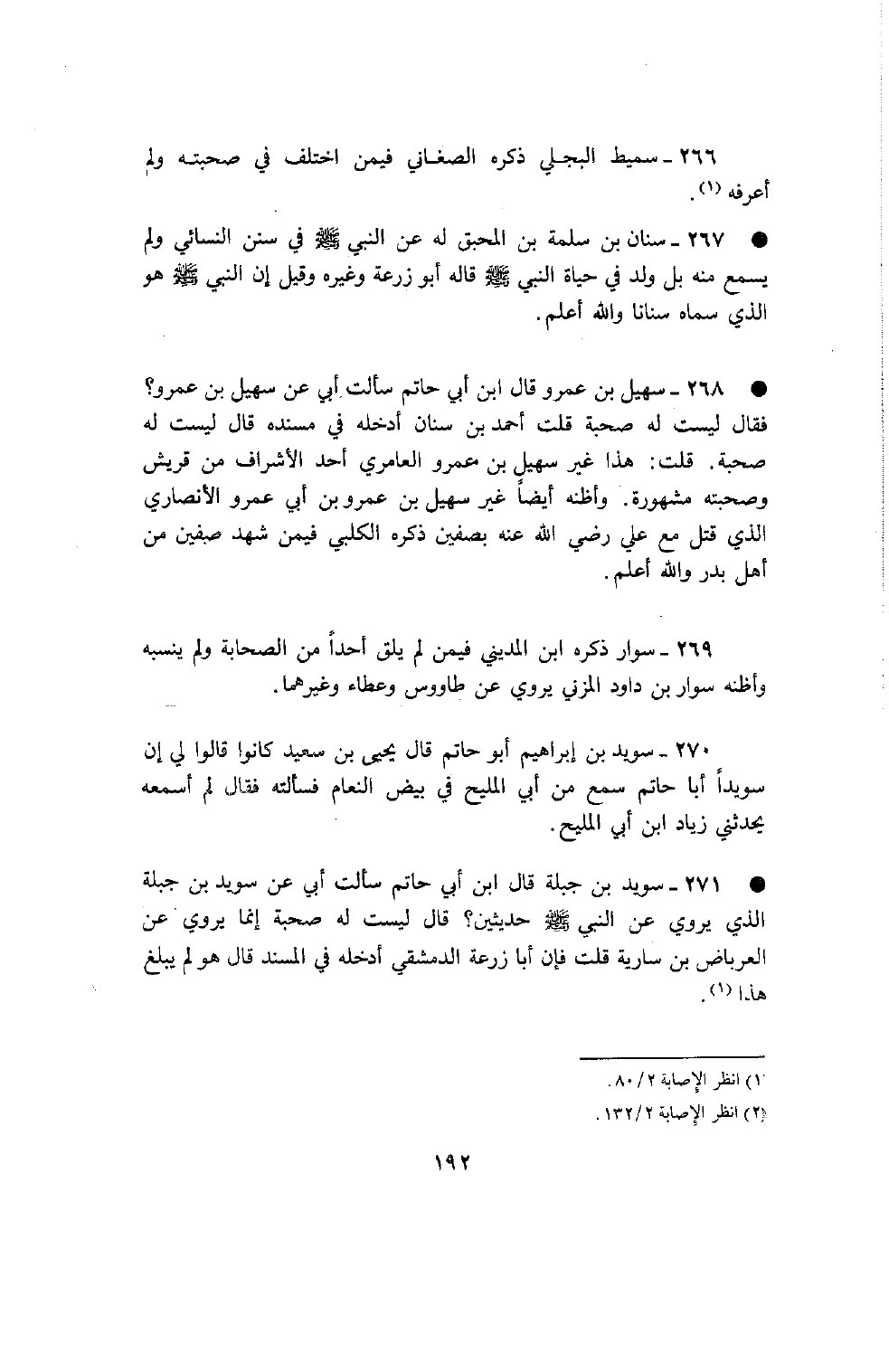 267 - سنان بن سلمة بن المحبق له عن النبي صلى الله عليه وسلم في سنن النسائي ولم يسمع منه بل ولد في حياة النبي صلى الله عليه وسلم قال أبو زرعة وغيره وقيل أن النبي صلى الله عليه وسلم هو الذي سماه سنانا والله أعلم