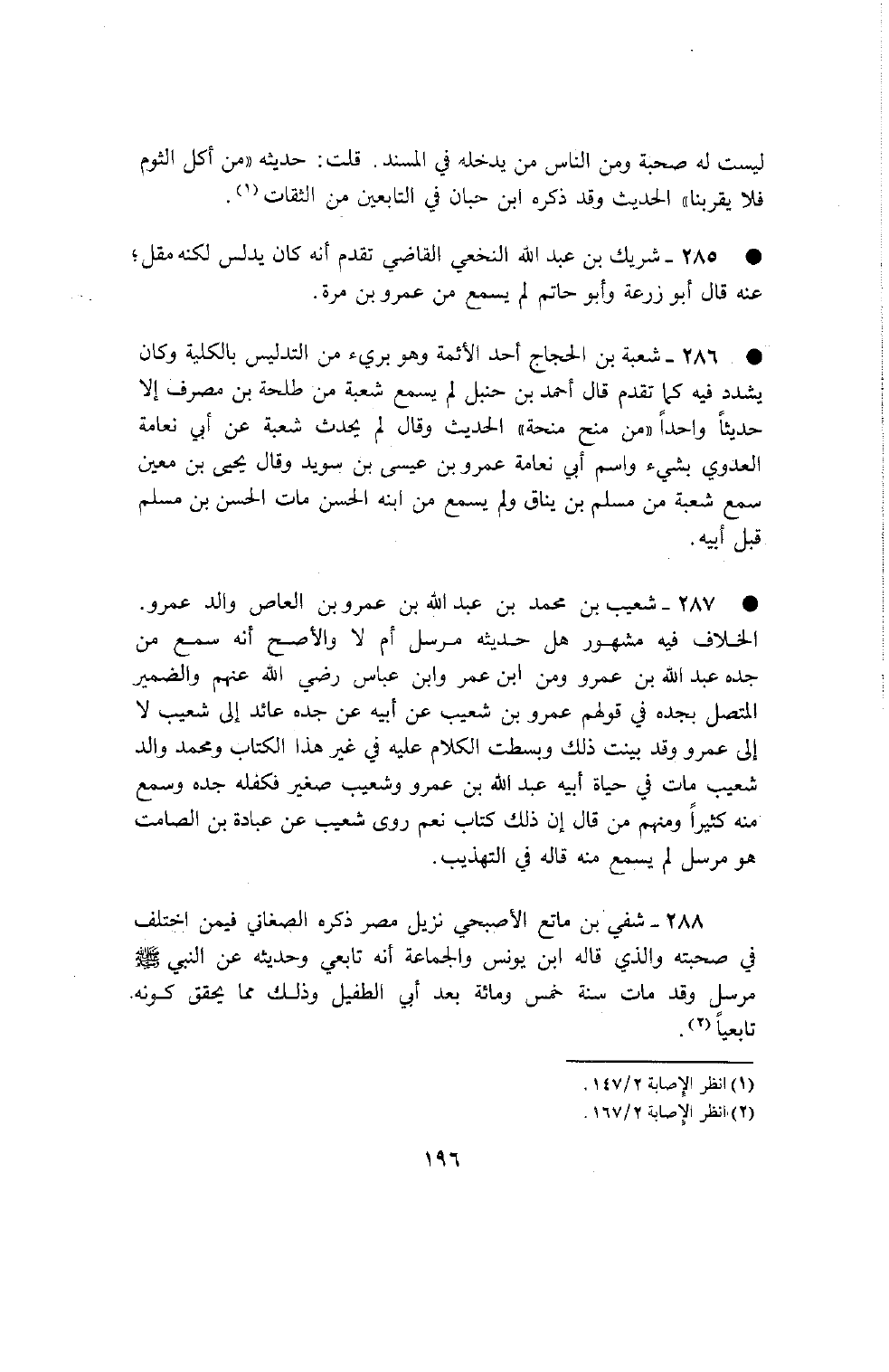 286 - شعبة بن الحجاج أحد الأئمة وهو بريء من التدليس بالكلية وكان يشدد فيه كما تقدم قال أحمد بن حنبل لم يسمع شعبة من طلحة بن مصرف إلا حديثا واحدا من منح منحة الحديث وقال لم يحدث شعبة عن أبي نعامة العدوي بشيء واسم أبي نعامة عمرو بن عيسى بن سويد وقال يحيى بن معين سمع شعبة من مسلم بن يناق ولم يسمع من ابنه الحسن مات الحسن بن مسلم قبل أبيه