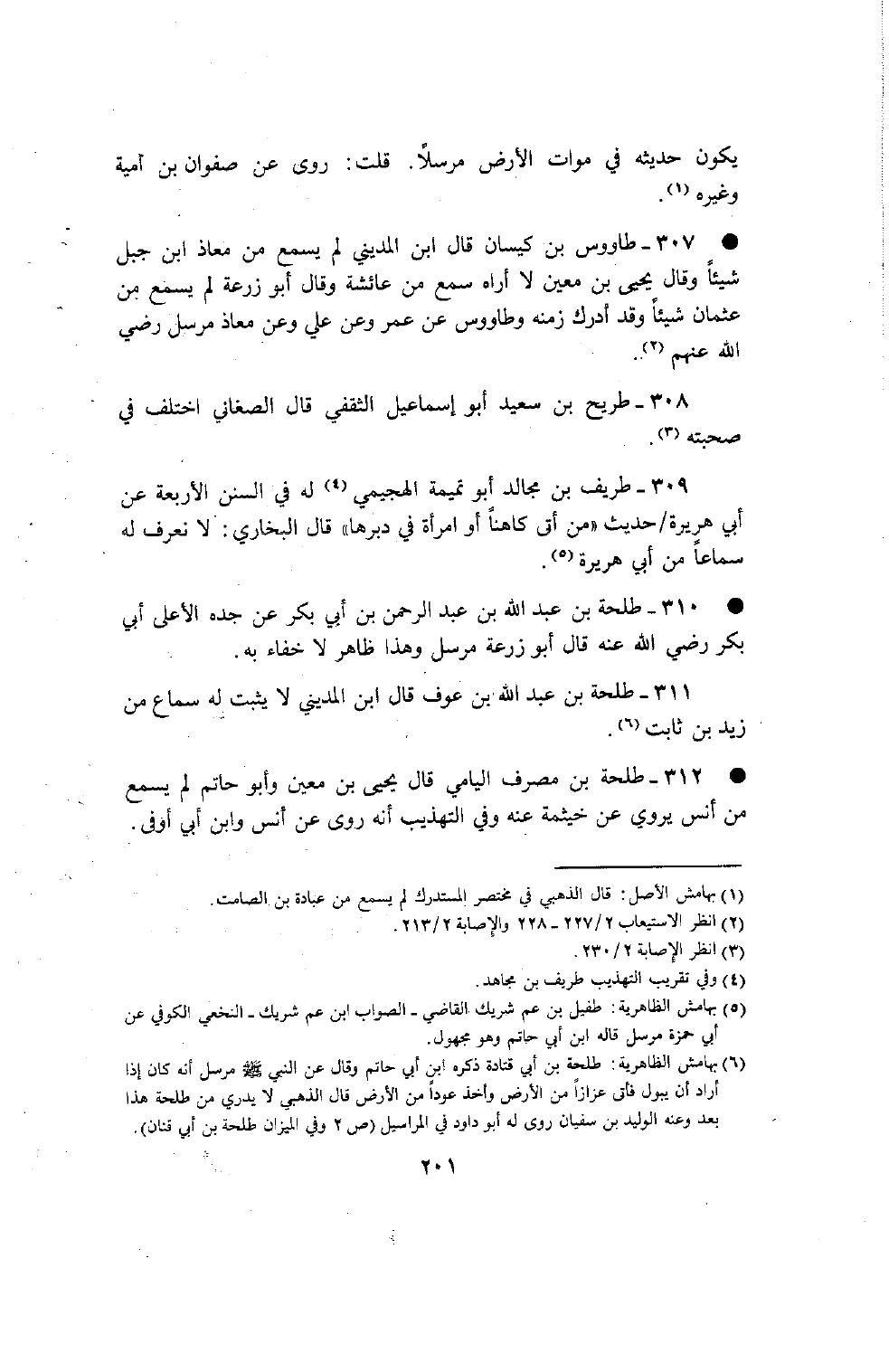 312 - طلحة بن مصرف اليامي قال يحيى بن معين وأبو حاتم لم يسمع من أنس يروي عن خيثمة عنه وفي التهذيب أنه روى عن أنس وابن أبي أوفى