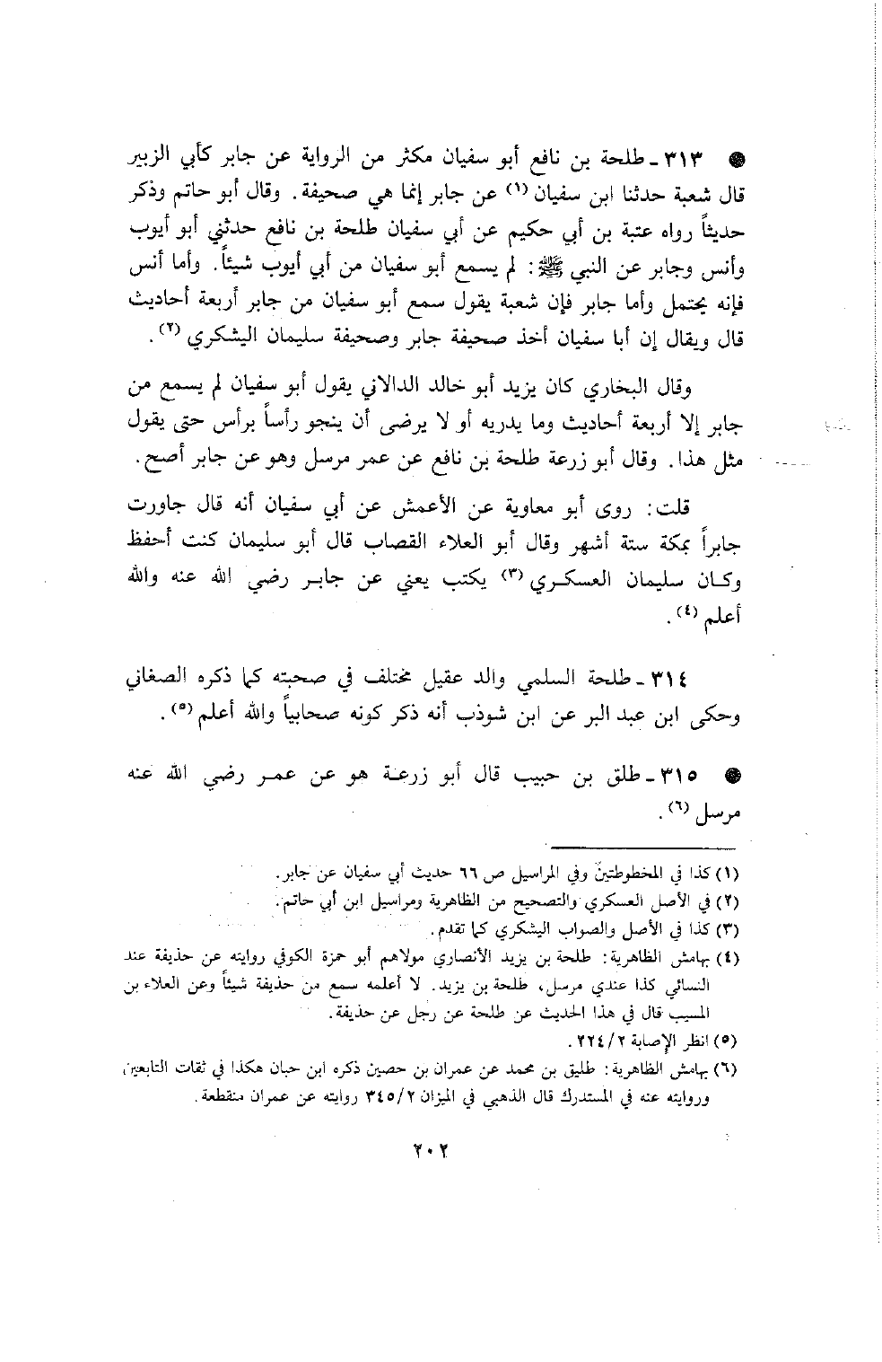 313 - طلحة بن نافع أبو سفيان مكثر من الرواية عن جابر كأبي الزبير قال شعبة حدثنا بن سفيان عن جابر إنما هي صحيفة وقال أبو حاتم وذكر حديثا رواه عتبة بن أبي حكيم عن أبي سفيان طلحة بن نافع حدثني أبو أيوب وأنس وجابر عن النبي صلى الله عليه وسلم لم يسمع أبو سفيان من أبي أيوب شيئا وأما أنس فإنه يحتمل وأما جابر فإن شعبة يقول سمع أبو سفيان من جابر أربعة أحاديث قال ويقال إن أبا سفيان أخذ صحيفة جابر وصحيفة سليمان اليشكري وقال البخاري كان يزيد أبو خالد الدالاني يقول أبو سفيان لم يسمع من جابر إلا أربعة أحاديث وما يدريه أو لا يرضى أن ينجو رأسا برأس حتى يقول مثل هذا وقال أبو زرعة طلحة بن نافع عن عمر مرسل وهو عن جابر أصح قلت روى أبو معاوية عن الأعمش عن أبي سفيان أنه قال جاورت جابرا بمكة ستة أشهر وقال أبو العلاء القصاب قال أبو سليمان كنت أحفظ وكان سليمان العسكري يكتب يعني عن جابر رضي الله عنه والله أعلم