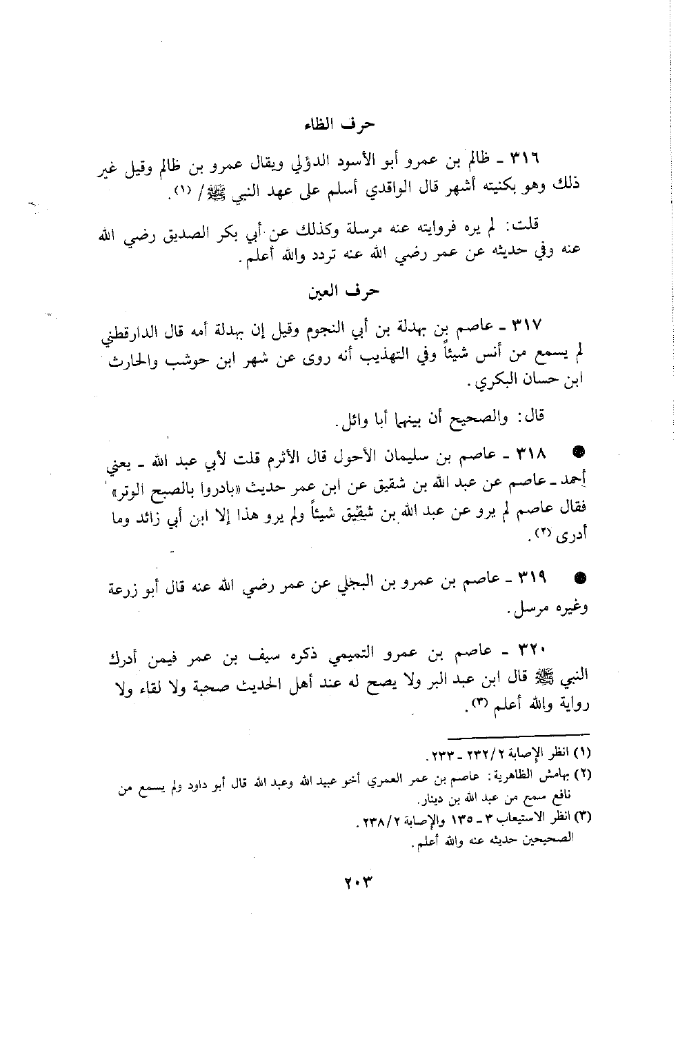 320 - عاصم بن عمرو التميمي ذكره سيف بن عمر فيمن أدرك النبي صلى الله عليه وسلم قال بن عبد البر ولا يصح له عند أهل الحديث صحبة ولا لقاء ولا رواية والله أعلم
