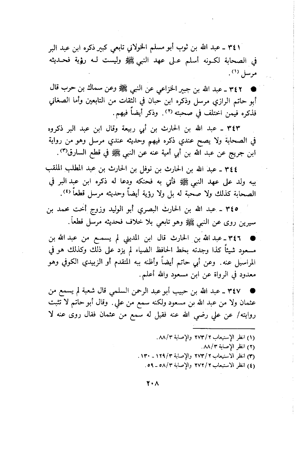344 - عبد الله بن الحارث بن نوفل بن الحارث بن عبد المطلب الملقب ببه ولد على عهد النبي صلى الله عليه وسلم فأتي به فحنكه ودعا له ذكره بن عبد البر في الصحابة كذلك ولا صحبة له بل ولا رؤية وحديثه مرسل قطعا