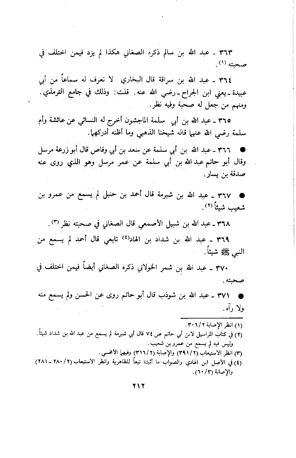364 - عبد الله بن سراقة قال البخاري لا نعرف له سماعا من أبي عبيدة يعني بن الجراح رضي الله عنه قلت وذلك في جامع الترمذي ومنهم من جعل له صحبة وفيه نظر