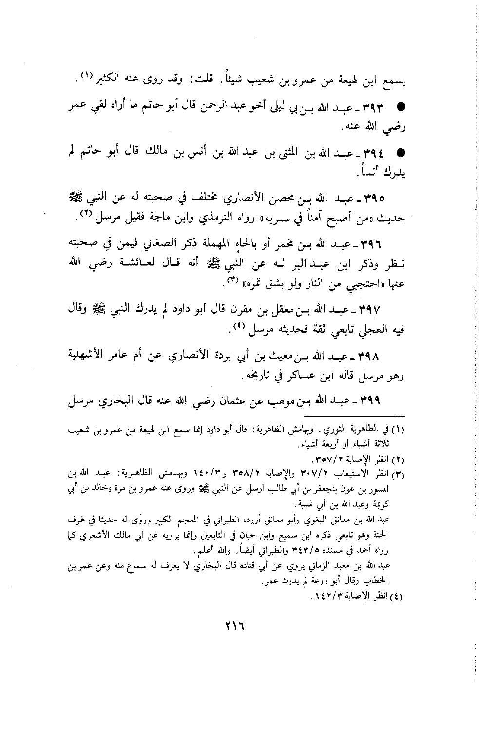 395 - عبد الله بن محصن الأنصاري مختلف في صحبته له عن النبي صلى الله عليه وسلم حديث من أصبح آمنا في سربه رواه الترمذي وابن ماجة فقيل مرسل