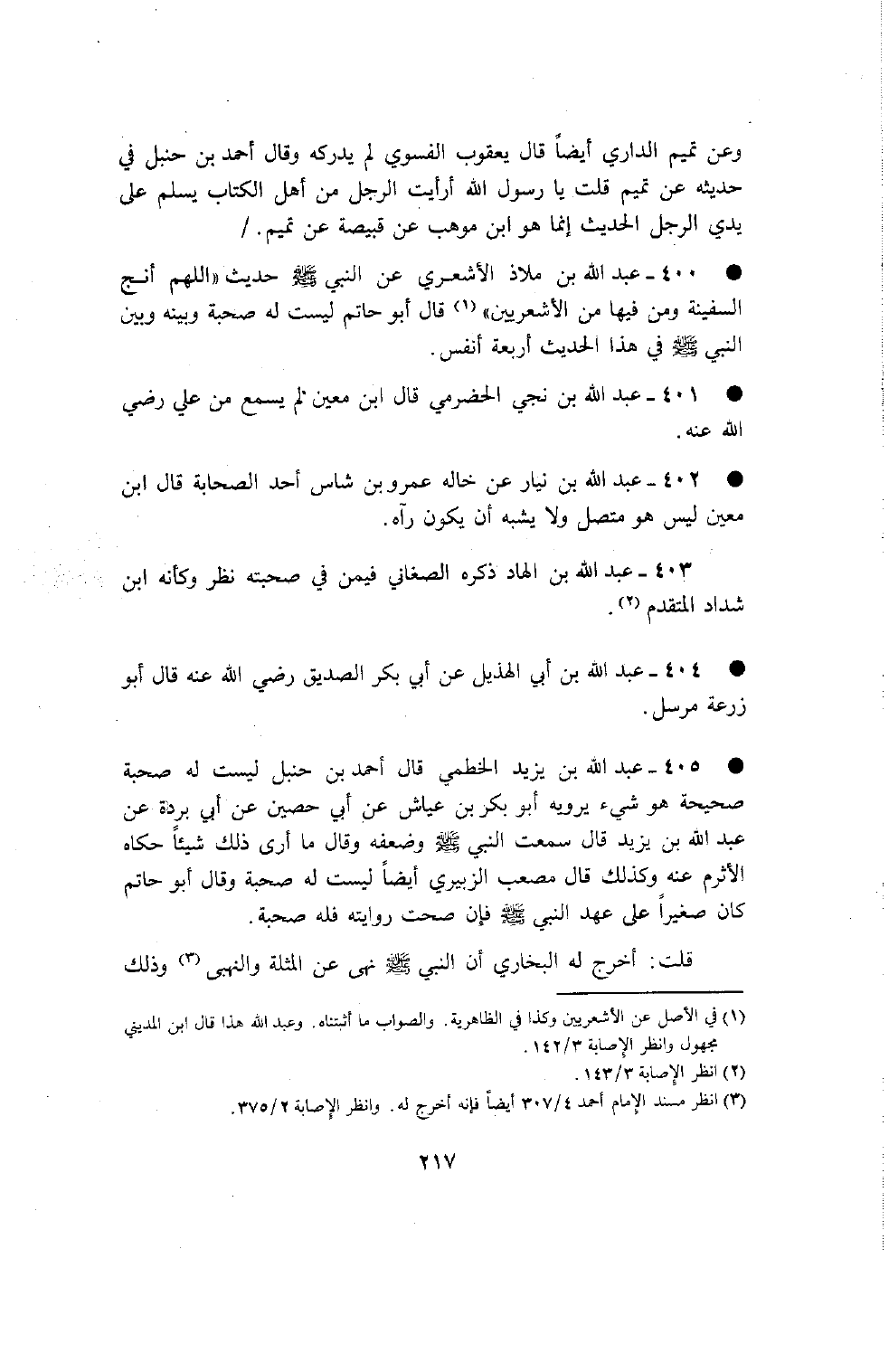 405 - عبد الله بن يزيد الخطمي قال أحمد بن حنبل ليست له صحبة صحيحة هو شيء يرويه أبو بكر بن عياش عن أبي حصين عن أبي بردة عن عبد الله بن يزيد قال سمعت النبي صلى الله عليه وسلم وضعفه وقال ما أرى ذلك شيئا حكاه الأثرم عنه وكذلك قال مصعب الزبيري أيضا ليست له صحبة وقال أبو حاتم كان صغيرا على عهد النبي صلى الله عليه وسلم فإن صحت روايته فله صحبة قلت أخرج له البخاري أن النبي صلى الله عليه وسلم نهى عن المثلة والنهبى وذلك يقتضي صحة سماعه وقد قيل إنه شهد الحديبية وهو بن سبع عشرة سنة والله أعلم