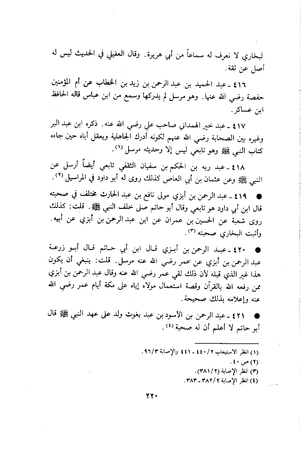 420 - عبد الرحمن بن أبزي قال بن أبي حاتم قال أبو زرعة عبد الرحمن بن أبزي عن عمر رضي الله عنه مرسل قلت ينبغي أن يكون هذا غير الذي قبله لأن ذلك لقي عمر رضي الله عنه وقال عبد الرحمن بن أبزي ممن رفعه الله بالقرآن وقصة استعمال مولاه إياه على مكة أيام عمر رضي الله عنه وإعلامه بذلك صحيحة
