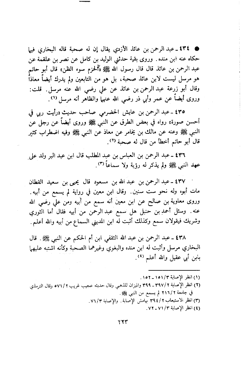 438 - عبد الرحمن بن عبد الله الثقفي بن أم الحكم عن النبي صلى الله عليه وسلم قال البخاري مرسل وأثبت له بن منده والبغوي وغيرهما الصحبة وكأنه اشتبه عليهما بابن أبي عقيل والله أعلم