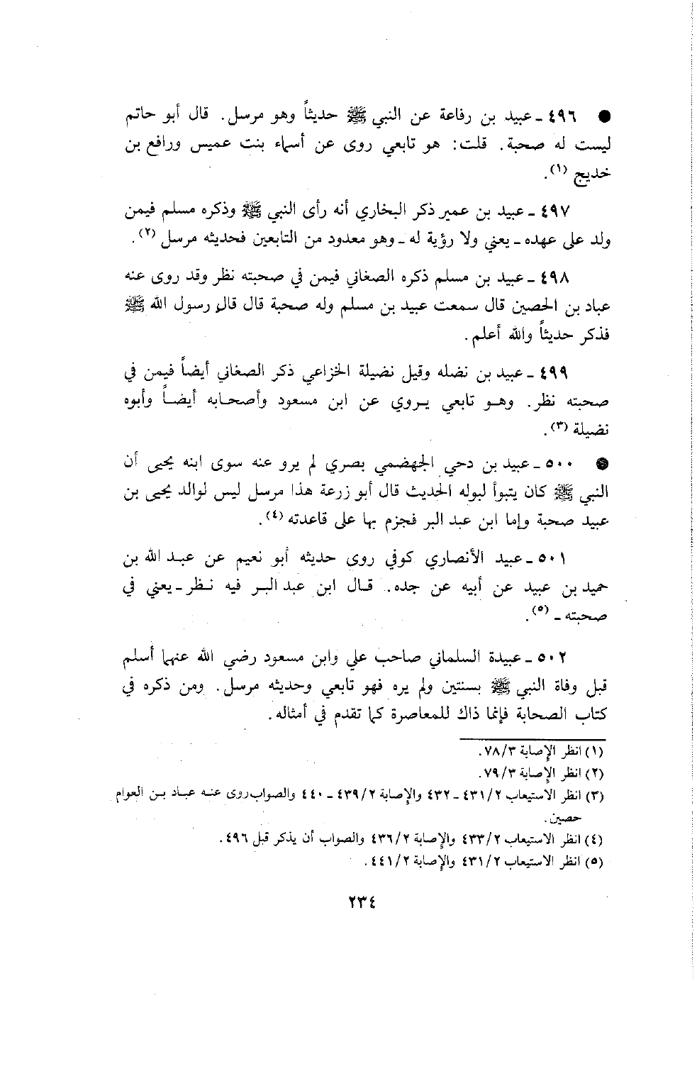 502 - عبيدة السلماني صاحب علي وابن مسعود رضي الله عنهما أسلم قبل وفاة النبي صلى الله عليه وسلم بسنتين ولم يره فهو تابعي وحديثه مرسل ومن ذكره في كتاب الصحابة فإنما ذاك للمعاصرة كما تقدم في أمثاله