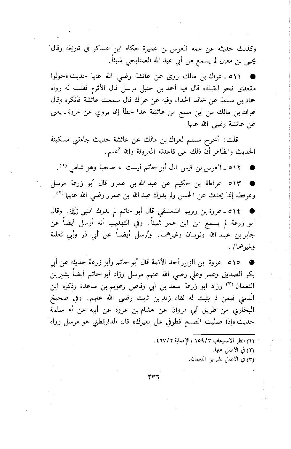 515 - عروة بن الزبير أحد الأئمة قال أبو حاتم وأبو زرعة حديثه عن أبي بكر الصديق وعمر وعلي رضي الله عنهم مرسل وزاد أبو حاتم أيضا بشير بن النعمان وزاد أبو زرعة سعد بن أبي وقاص وعويم بن ساعدة وذكره بن المديني فيمن لم يثبت له لقاء زيد بن ثابت رضي الله عنهم وفي صحيح البخاري من طريق أبي مروان عن هشام بن عروة عن أبيه عن أم سلمة حديث إذا صليت الصبح فطوفي على بعيرك قال الدارقطني هو مرسل رواه حفص بن غياث عن هشام بن عروة عن أبيه عن زينب بنت أم سلمة عن أم سلمة وكذلك رواه مالك في الموطأ عن أبي الأسود عن عروة