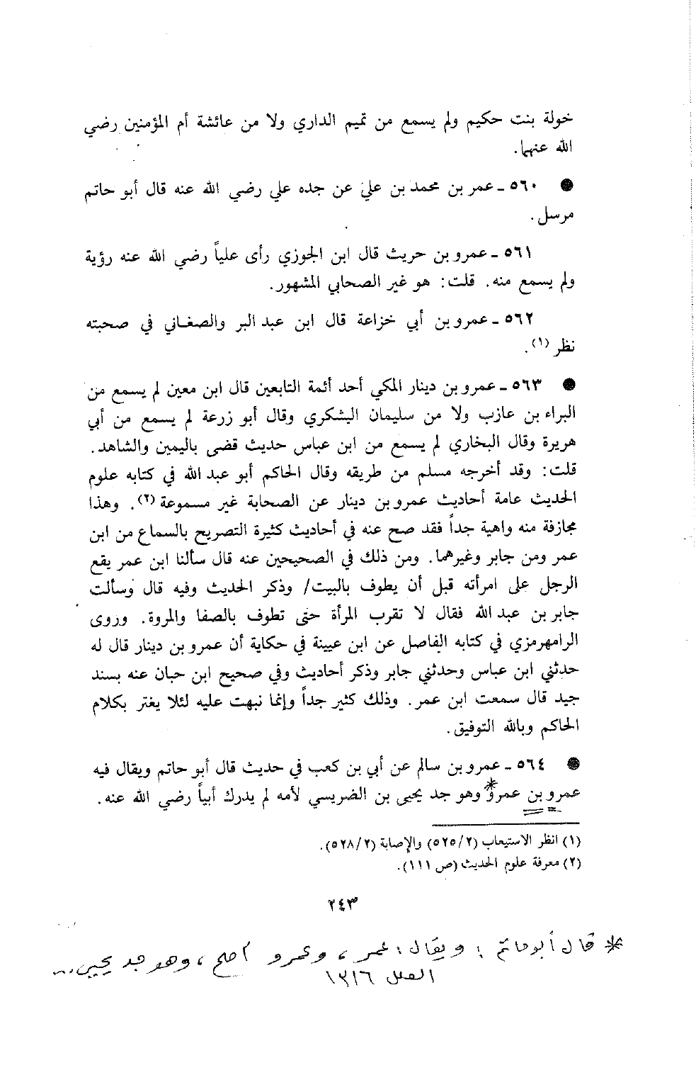 563 - عمرو بن دينار المكي أحد أئمة التابعين قال بن معين لم يسمع من البراء بن عازب ولا من سليمان اليشكري وقال أبو زرعة لم يسمع من أبي هريرة وقال البخاري لم يسمع من بن عباس حديث قضى باليمين والشاهد قلت وقد أخرجه مسلم من طريقه وقال الحاكم أبو عبد الله في كتابه علوم الحديث عامة أحاديث عمرو بن دينار عن الصحابة غير مسموعة وهذا مجازفة منه واهية جدا فقد صح عنه في أحاديث كثيرة التصريح بالسماع من بن عمر ومن جابر وغيرهما ومن ذلك في الصحيحين عنه قال سألنا بن عمر يقع الرجل على امرأته قبل أن يطوف بالبيت وذكر الحديث وفيه قال وسألت جابر بن عبد الله فقال لا تقرب المرأة حتى تطوف بالصفا والمروة وروى الرامهرمزي في كتابه الفاصل عن بن عيينة في حكاية أن عمرو بن دينار قال له حدثني بن عباس وحدثني جابر وذكر أحاديث وفي صحيح بن حبان عنه بسند جيد قال سمعت بن عمر وذلك كثير جدا وإنما نبهت عليه لئلا يغتر بكلام الحاكم وبالله التوفيق