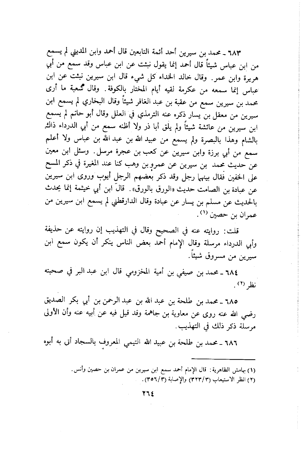 683 - محمد بن سيرين أحد أئمة التابعين قال أحمد وابن المديني لم يسمع من بن عباس شيئا قال أحمد إنما يقول نبئت عن بن عباس وقد سمع من أبي هريرة وابن عمر وقال خالد الحذاء كل شيء قال بن سيرين نبئت عن بن عباس إنما سمعه من عكرمة لقيه أيام المختار بالكوفة وقال شعبة ما أرى محمد بن سيرين سمع من عقبة بن عبد الغافر شيئا وقال البخاري لم يسمع بن سيرين من معقل بن يسار ذكره عنه الترمذي في العلل وقال أبو حاتم لم يسمع بن سيرين من عائشة شيئا ولم يلق أبا ذر ولا أظنه سمع من أبي الدرداء ذلك بالشام وهذا بالبصرة ولم يسمع من عبيد الله بن عبد الله بن عباس ولا أعلم سمع من أبي برزة وابن سيرين عن كعب بن عجرة مرسل وسئل بن معين عن حديث محمد بن سيرين عن عمرو بن وهب كنا عند المغيرة في ذكر المسح على الخفين فقال بينهما رجل وقد ذكر بعضهم الرجل أيوب وروى بن سيرين عن عبادة بن الصامت حديث الورق بالورق قال بن أبي خيثمة إنما يحدث بالحديث عن مسلم بن يسار عن عبادة وقال الدارقطني لم يسمع بن سيرين من عمران بن حصين قلت روايته عنه في الصحيح وقال في التهذيب إن روايته عن حذيفة وأبي الدرداء مرسلة وقال الإمام أحمد بعض الناس ينكر أن يكون سمع بن سيرين من مسروق شيئا