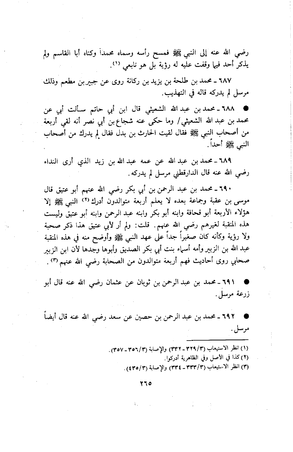 690 - محمد بن عبد الرحمن بن أبي بكر رضي الله عنهم أبو عتيق قال موسى بن عقبة وجماعة بعده لا يعلم أربعة متوالدون أدرك النبي صلى الله عليه وسلم إلا هؤلاء الأربعة أبو قحافة وابنه أبو بكر وابنه عبد الرحمن وابنه أبو عتيق وليست هذه المنقبة لغيرهم رضي الله عنهم قلت ولم أر لأبي عتيق هذا ذكر صحبة ولا رؤية وكأنه كان صغيرا جدا على عهد النبي صلى الله عليه وسلم وأوضح منه في هذه المنقبة عبد الله بن الزبير وأمه أسماء بنت أبي بكر الصديق وأبوها وجدها لأن بن الزبير صحابي روى أحاديث فهم أربعة متوالدون من الصحابة رضي الله عنهم