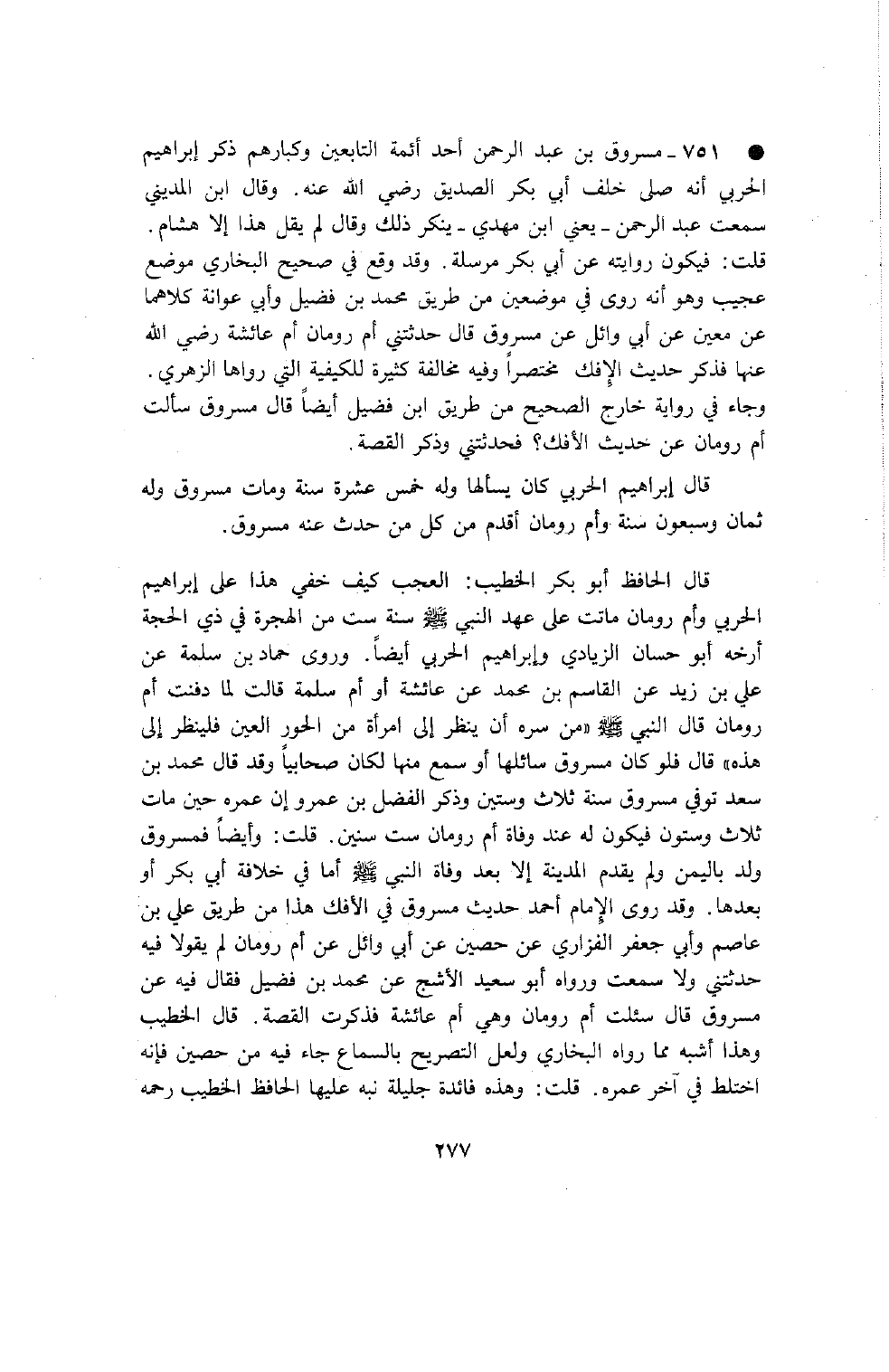 751 - مسروق بن عبد الرحمن أحد أئمة التابعين وكبارهم ذكر إبراهيم الحربي أنه صلى خلف أبي بكر الصديق رضي الله عنه وقال بن المديني سمعت عبد الرحمن يعني بن مهدي ينكر ذلك وقال لم يقل هذا إلا هشام قلت فيكون روايته عن أبي بكر مرسلة وقد وقع في صحيح البخاري موضع عجيب وهو أنه روى في موضعين من طريق محمد بن فضيل وأبي عوانة كلاهما عن معين عن أبي وائل عن مسروق قال حدثتني أم رومان أم عائشة رضي الله عنها فذكر حديث الإفك مختصرا وفيه مخالفة كثيرة للكيفية التي رواها الزهري وجاء في رواية خارج الصحيح من طريق بن فضيل أيضا قال مسروق سألت أم رومان عن حديث الإفك فحدثتني وذكر القصة قال إبراهيم الحربي كان يسألها وله خمس عشرة سنة ومات مسروق وله ثمان وسبعون سنة وأم رومان أقدم من كل من حدث عنه مسروق قال الحافظ أبو بكر الخطيب العجب كيف خفي هذا على إبراهيم الحربي وأم رومان ماتت على عهد النبي صلى الله عليه وسلم سنة ست من الهجرة في ذي الحجة أرخه أبو حسان الزيادي وإبراهيم الحربي أيضا وروى حماد بن سلمة عن علي بن زيد عن القاسم بن محمد عن عائشة أو أم سلمة قالت لما دفنت أم رومان قال النبي صلى الله عليه وسلم من سره أن ينظر إلى امرأة من الحور العين فلينظر إلى هذه قال فلو كان مسروق سائلها أو سمع منها لكان صحابيا وقد قال محمد بن سعد توفي مسروق سنة ثلاث وستين وذكر الفضل بن عمرو إن عمره حين مات ثلاث وستون فيكون له عند وفاة أم رومان ست سنين قلت وأيضا فمسروق ولد باليمن ولم يقدم المدينة إلا بعد وفاة النبي صلى الله عليه وسلم أما في خلافة أبو بكر أو بعدها وقد روى الإمام أحمد حديث مسروق في الإفك هذا من طريق علي بن عاصم وأبي جعفر الفزاري عن حصين عن أبي وائل عن أم رومان لم يقولا فيه حدثتني ولا سمعت ورواه أبو سعيد الأشج عن محمد بن فضيل فقال فيه عن مسروق قال سئلت أم رومان وهي أم عائشة فذكرت القصة قال الخطيب وهذا أشبه مما رواه البخاري ولعل التصريح بالسماع جاء فيه من حصين فإنه اختلط في آخر عمره قلت وهذه فائدة جليلة نبه عليها الحافظ الخطيب رحمه الله وحاصلها أن الحديث الذي أخرجه البخاري مرسل وخفي ذلك على الإمام البخاري والله أعلم