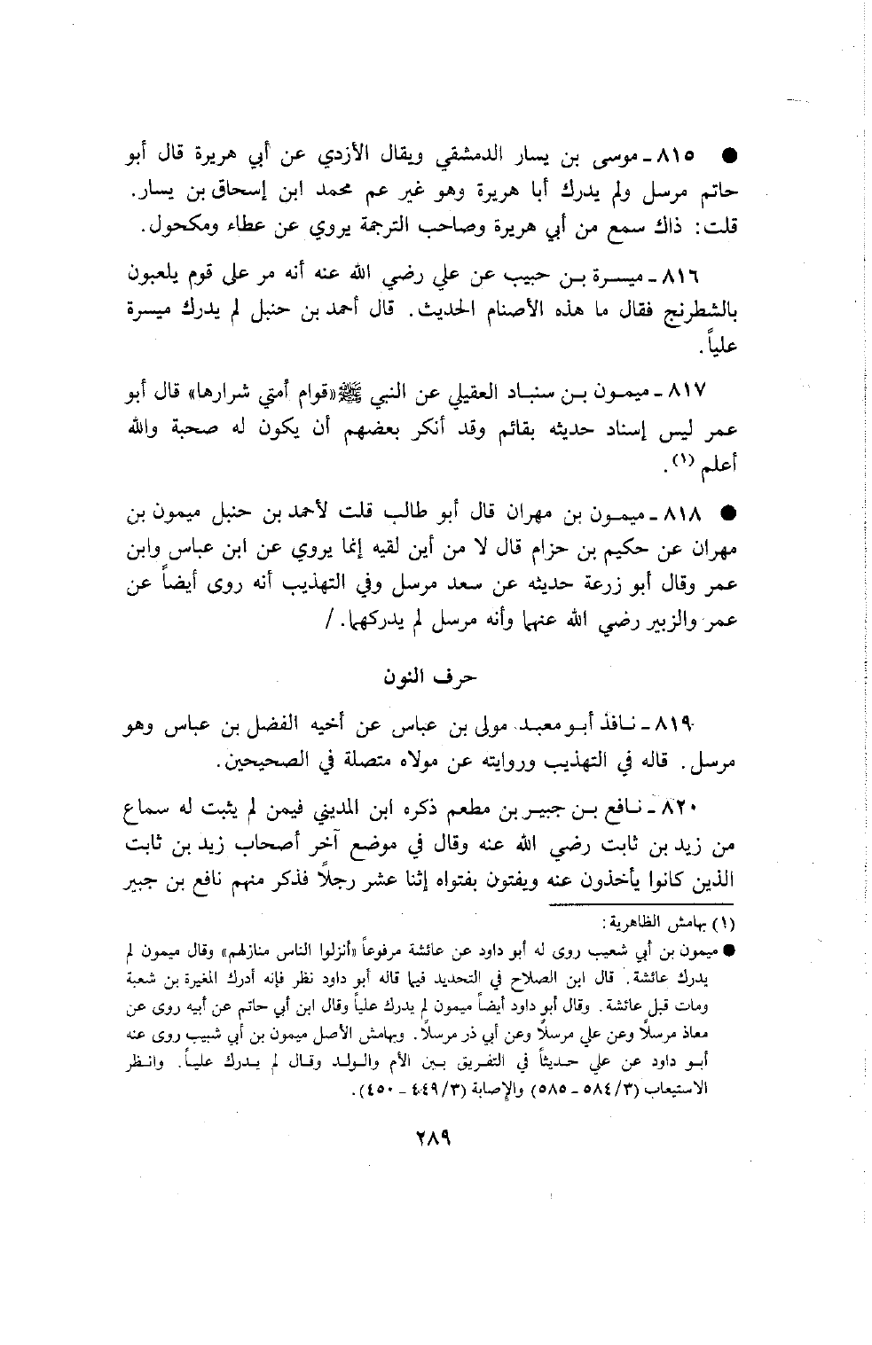 818 - ميمون بن مهران قال أبو طالب قلت لأحمد بن حنبل ميمون بن مهران عن حكيم بن حزام قال لا من أين لقيه إنما يروي عن بن عباس وابن عمر وقال أبو زرعة حديثه عن سعد مرسل وفي التهذيب أنه روى أيضا عن عمر والزبير رضي الله عنهما وأنه مرسل لم يدركهما