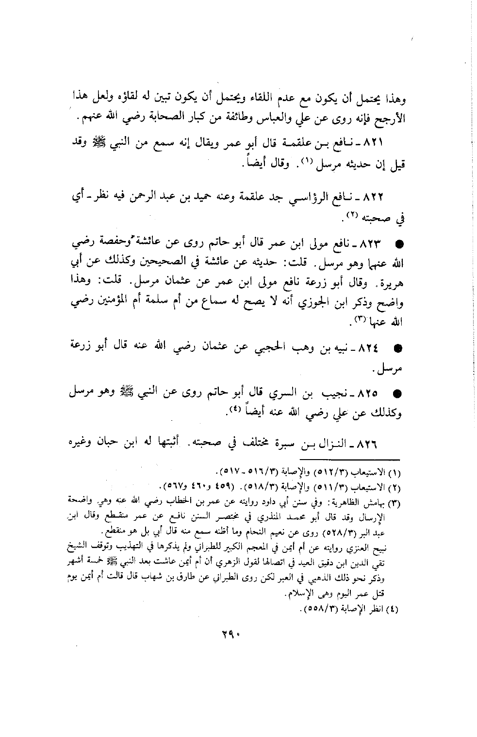 823 - نافع مولى بن عمر قال أبو حاتم روى عن عائشة وحفصة رضي الله عنهما وهو مرسل قلت حديثه عن عائشة في الصحيحين وكذلك عن أبي هريرة وقال أبو زرعة نافع مولى بن عمر عن عثمان مرسل قلت وهذا واضح وذكر بن الجوزي أنه لا يصح له سماع من أم سلمة أم المؤمنين رضي الله عنها