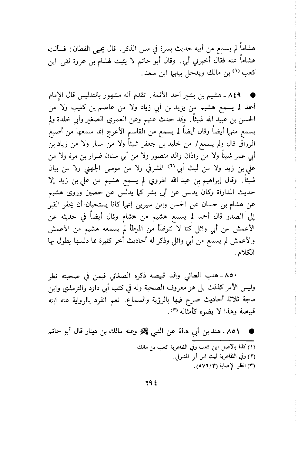 849 - هشيم بن بشير أحد الأئمة تقدم أنه مشهور بالتدليس قال الإمام أحمد لم يسمع هشيم من يزيد بن أبي زياد ولا من عاصم بن كليب ولا من الحسن بن عبيد الله شيئا وقد حدث عنهم وعن العمري الصغير وأبي خلدة ولم يسمع منهما أيضا وقال أيضا لم يسمع من القاسم الأعرج إنما سمعها من أصبغ الوراق قال ولم يسمع من خليد بن جعفر شيئا ولا من سيار ولا من زياد بن أبي عمر شيئا ولا من زاذان والد منصور ولا من أبي سنان ضرار بن مرة ولا من علي بن زيد ولا من ليث أبي المشرفي ولا من موسى الجهني ولا من بيان شيئا وقال إبراهيم بن عبد الله الهروي لم يسمع هشيم من علي بن زيد إلا حديث المداراة وكان يدلس عن أبي بشر كما يدلس عن حصين وروى هشيم عن هشام بن حسان عن الحسن وابن سيرين إنهما كانا يستحبان أن يحفر القبر إلى الصدر قال أحمد لم يسمع هشيم من هشام وقال أيضا في حديثه عن الأعمش عن أبي وائل كنا لا نتوضأ من الموطأ لم يسمعه هشيم من الأعمش والأعمش لم يسمع من أبي وائل وذكر له أحاديث أخر كثيرة مما دلسها يطول بها الكلام