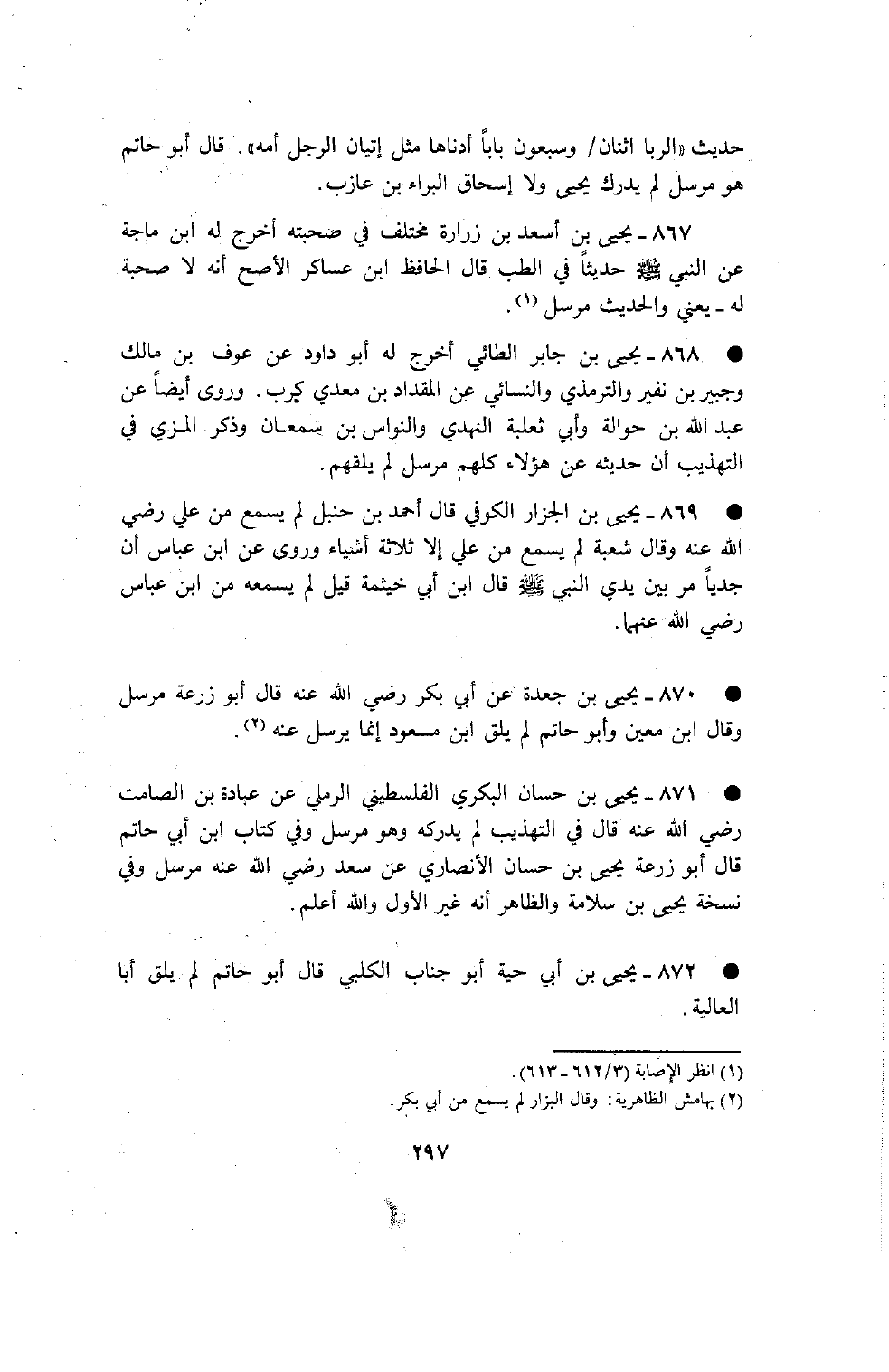 871 - يحيى بن حسان البكري الفلسطيني الرملي عن عبادة بن الصامت رضي الله عنه قال في التهذيب لم يدركه وهو مرسل وفي كتاب بن أبي حاتم قال أبو زرعة يحيى بن حسان الأنصاري عن سعد رضي الله عنه مرسل وفي نسخة يحيى بن سلامة والظاهر أنه غير الأول والله أعلم