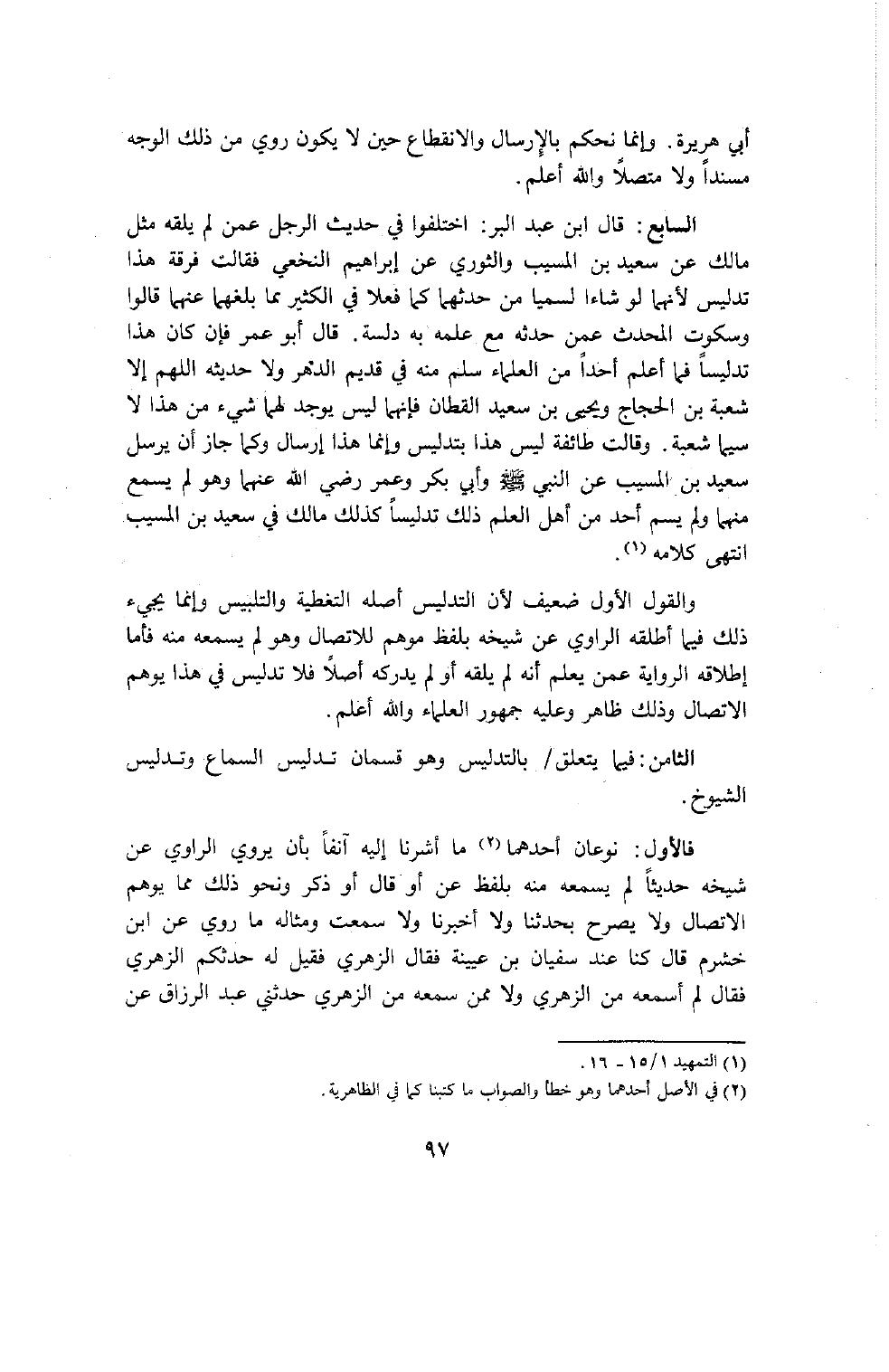 وقال آخرون إن كان الغالب عليه التدليس عمن عاصره ولم يلقه ولا سمع منه لم تقبل روايته مطلقا وإن كان تدليسه عمن قد لقيه وسمع منه ما صرح فيه بالسماع دون ما دلس