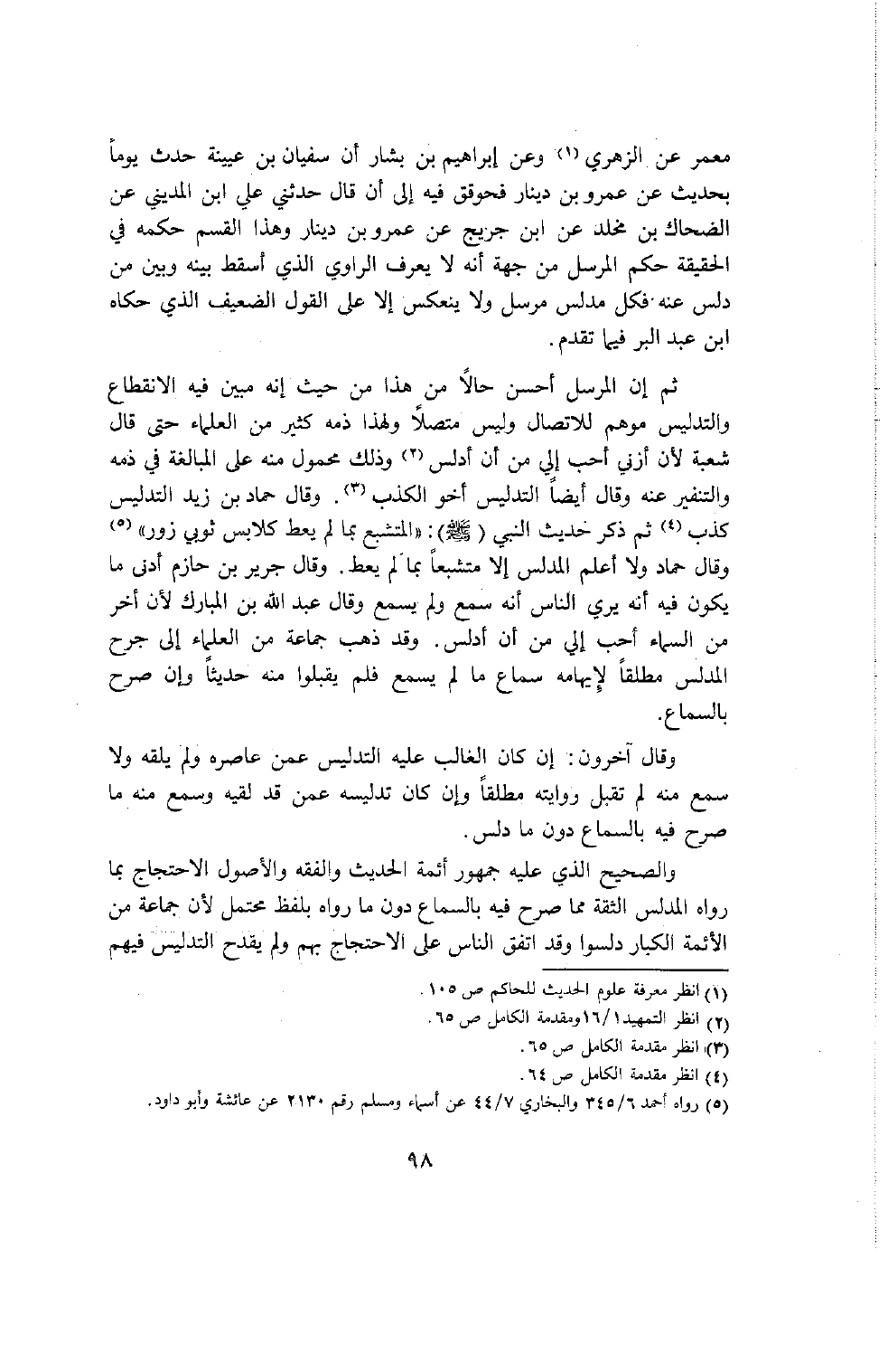 كقتادة والأعمش والسفيانين الثوري وابن عيينة وهشيم بن بشير وخلق كثير وأيضا فإن التدليس ليس كذبا صريحا بل هو ضرب من الإيهام بلفظ محتمل كما قال الإمام الشافعي رحمه الله ومن عرفناه دلس مرة فقد أبان لنا عورته وليست تلك العورة بكذب فيرد حديثه ولا على النصيحة في الصدق فيقبل منه ما قبلناه من أهل الصدق فلذلك قلنا إنه لا يقبل من المدلس حديث حتى يقول حدثنا وسمعت هذا لفظه وقد قسم الحاكم أبو عبد الله في كتابه علوم الحديث أجناس المدلسين إلى ستة أقسام وبعضها متداخل