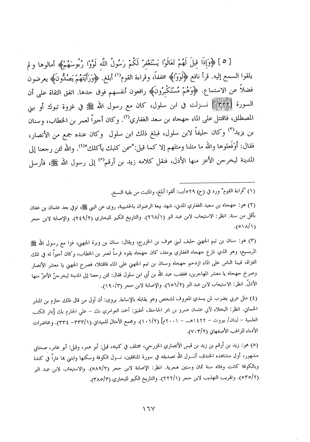 (وَإِذَا قِيلَ لَهُمْ تَعَالَوْا يَسْتَغْفِرْ لَكُمْ رَسُولُ اللَّهِ لَوَّوْا رُءُوسَهُمْ ... (5) أمالوها ولم يلقوا السمع إليه. قرأ نافع (لَوَوْا) مخففاً، وقراءة القوم أبلغ. (وَرَأَيْتَهُمْ يَصُدُّونَ) يعرضون فضلاً عن الاستماع. (وَهُمْ مُسْتَكْبِرُونَ) رافعون أنفسهم فوق حدها. اتفق الثقاة على أن السورة نزلت في ابن سلول، كان مع رسول اللَّه - صلى الله عليه وسلم - في غزوة تبوك أو بني المصطلق، فاقتتل على الماء جهجاه بن سعد الغفاري. وكان أجيراً لعمر بن الخطاب، وسنان بن يزيد وكان حليفاً لابن سلول، فبلغ ذلك ابن سلول وكان عنده جمع من الأنصار، فقال: أَوَفَعلوها واللَّه ما مثلنا ومثلهم إلا كما قيل: " سمن كلبك يأكلك " واللَّه لئن رجعنا إلى المدينة ليخرجن الأعز منها الأذل، فنقل كلامه زيد بن أرقم إلى رسول اللَّه - صلى الله عليه وسلم -، فأرسل
