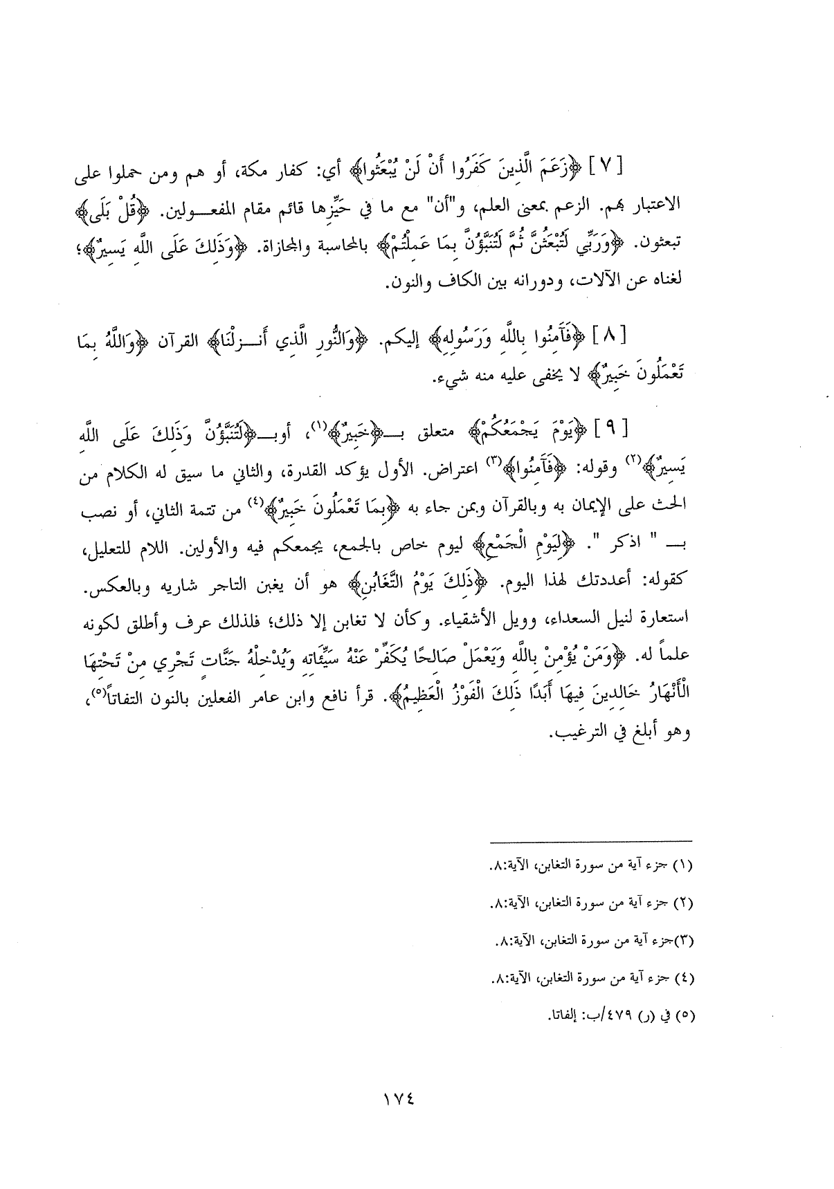 (يَوْمَ يَجْمَعُكُمْ ... (9) متعلق بـ (خَبِير)، أو بـ (لَتُنَبَّؤُنَّ ... وَذَلِكَ عَلَى اللَّه يَسِير) وقوله: (فَآمِنُوا) اعتراض. الأول يؤكد القدرة، والثاني ما سيق له الكلام من الحث على الإيمان به وبالقرآن وبمن جاء به (بِمَا تَعْمَلُونَ خَبيرٌ) من تتمة الثاني، أو نصب بـ " اذكر ". (لِيَوْمِ الْجَمْعِ) ليوم خاص بالجمع، يجمعكم فيه والأولين. اللام للتعليل، كقوله: أعددتك لهذا اليوم. (ذَلِكَ يَوْمُ التَّغَابُنِ) هو أن يغبن التاجر شاريه وبالعكس. استعارة لنيل السعداء، وويل الأشقياء. وكأن لا تغابن إلا ذلك؛ فلذلك عرف وأطلق لكونه علماً له. (وَمَنْ يُؤْمِنْ بِاللَّهِ وَيَعْمَلْ صَالِحًا يُكَفِّرْ عَنْهُ سَيِّئَاتِهِ وَيُدْخِلْهُ جَنَّاتٍ تَجْرِي مِنْ تَحْتِهَا الْأَنْهَارُ خَالِدِينَ فِيهَا أَبَدًا ذَلِكَ الْفَوْزُ الْعَظِيمُ). قرأ نافع وابن عامر الفعلين بالنون التفاتاً، وهو أبلغ في الترغيب.