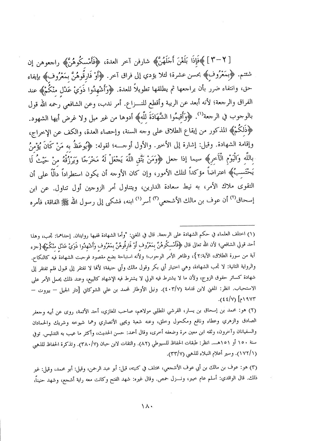 (فَإِذَا بَلَغْنَ أَجَلَهُنَّ ... (2) شارفن آخر العدة، (فَأَمْسِكُوهُنَّ) راجعوهن إن شئتم. (بِمَعْرُوفٍ) بحسن عشرة؛ لئلا يؤدي إلى فراق آخر. (أَوْ فَارِقُوهُنَّ بِمَعْرُوفٍ) بإيفاء حق، وانتفاء ضرر بأن يراجعها ثم يطلقها تطويلاً للعدة. (وَأَشْهِدُوا ذَوَيْ عَدْلٍ مِنْكُمْ) عند الفراق والرجعة؛ لأنه أبعد عن الريبة وأقطع للنزاع. أمر ندب، وعن الشافعي رحمه اللَّه قول بالوجوب في الرجعة. (وَأَقِيمُوا الشَهَادَهَّ لِلَّهِ) أدوها من غير ميل ولا غرض أيها الشهود.