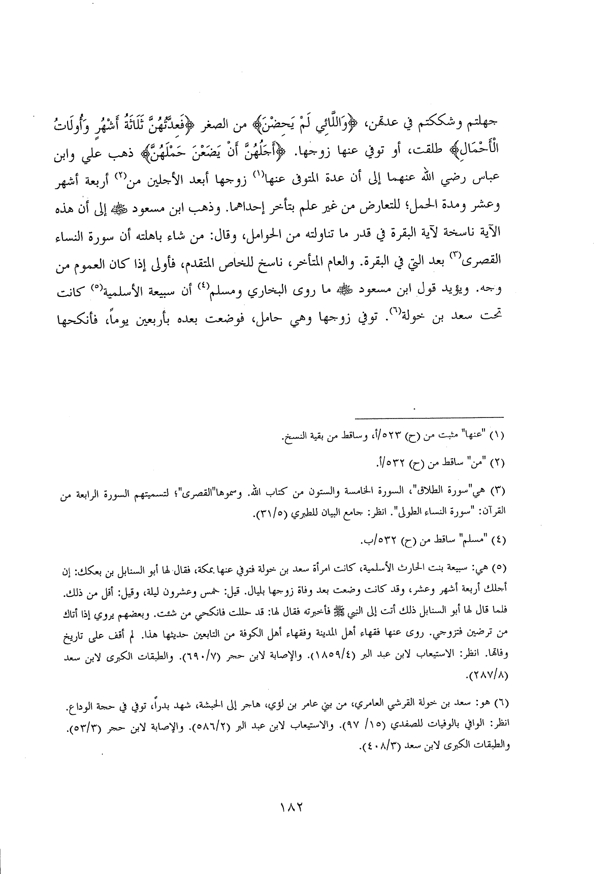 جهلتم وشككتم في عدتهن، (وَاللَّائِي لَمْ يَحِضْنَ) من الصغر (فَعِدَّتُهُنَّ ثَلَاثَةُ) (وَأُولَاتُ الْأَحْمَالِ) طلقت، أو توفي عنها زوجها. (أَجَلُهُنَّ أَنْ يَضَعْنَ حَمْلَهُنَّ) ذهب علي وابن عباس رضي اللَّه عنهما إلى أن عدة المتوفى عنها زوجها أبعد الأجلين من أربعة أشهر وعشر ومدة الحمل؛ للتعارض من غير علم بتأخر إحداهما. وذهب ابن مسعود - رضي الله عنه - إلى أن هذه الآية ناسخة لآية البقرة في قدر ما تناولته من الحوامل، وقال: من شاء باهلته أن سورة النساء القصرى بعد التي في البقرة. والعام المتأخر، ناسخ للخاص المتقدم، فأولى إذا كان العموم من وجه. ويؤيد قول ابن مسعود - رضي الله عنه - ما روى البخاري ومسلم أن سبيعة الأسلمية كانت تحت سعد بن خولة. توفي زوجها وهي حامل، فوضعت بعده بأربعين يوماً، فأنكحها