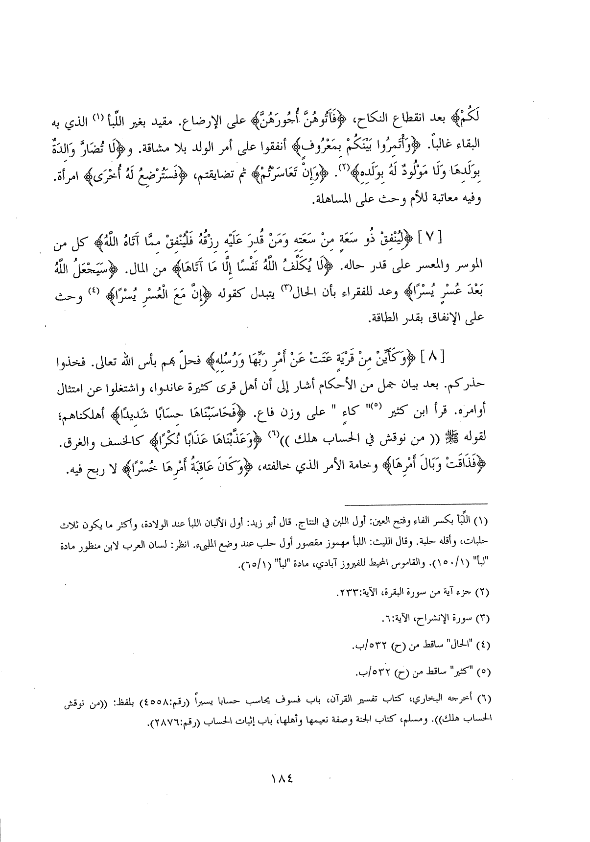 (لِيُنْفِقْ ذُو سَعَةٍ مِنْ سَعَتِهِ وَمَنْ قُدِرَ عَلَيْهِ رِزْقُهُ فَلْيُنْفِقْ مِمَّا آتَاهُ اللَّهُ ... (7) كل من الموسر والمعسر على قدر حاله. (لَا يُكَلِّفُ اللَّهُ نَفْسًا إِلَّا مَا آتَاهَا) من المال، (سَيَجْعَلُ اللَّهُ بَعْدَ عُسْرٍ يُسْرًا) وعد للفقراء بأن الحال يتبدل كقوله (إِن مَعَ الْعُسْرِ يُسْرًا) وحث على الإنفاق بقدر الطاقة.