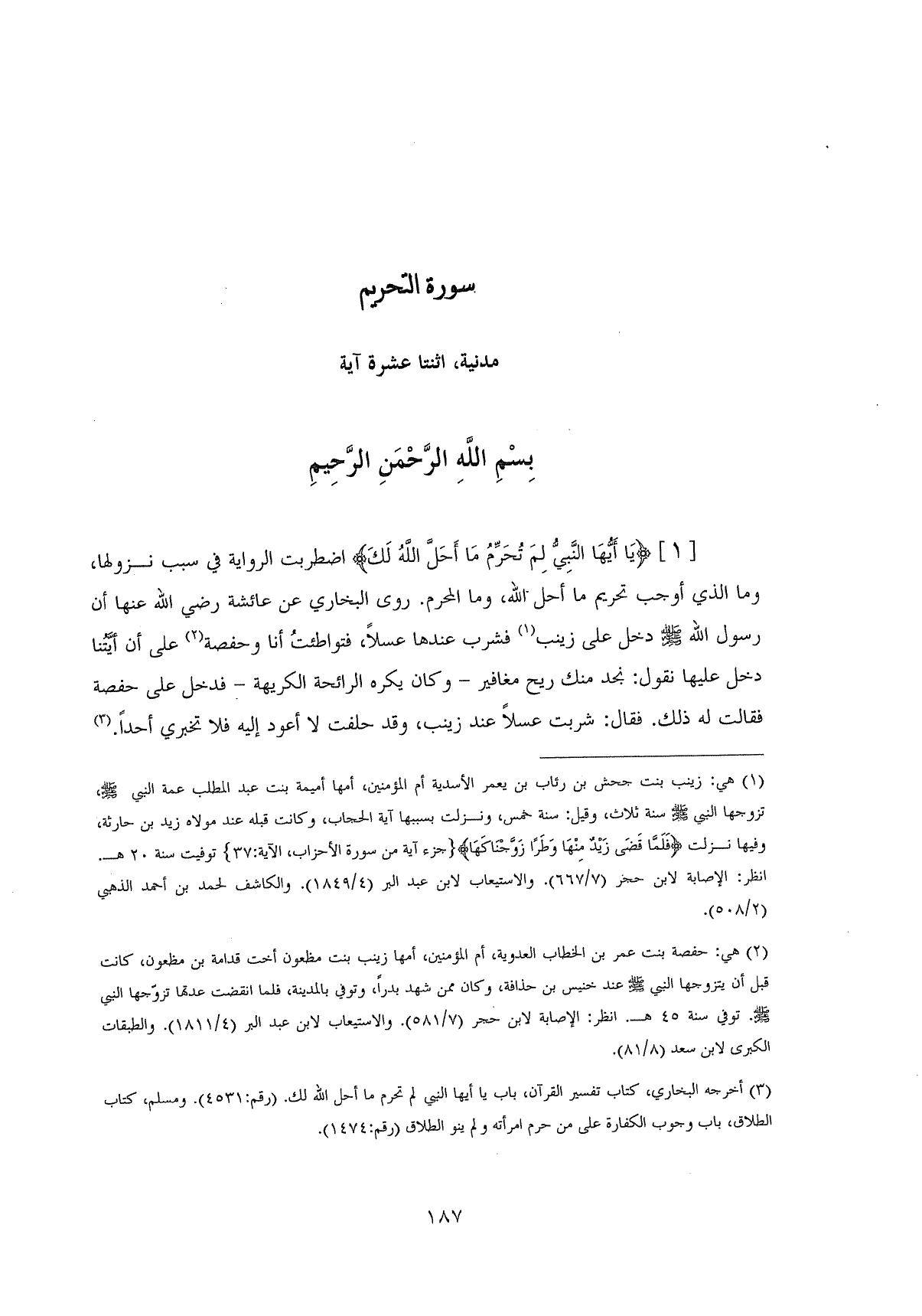 (يَا أَيُّهَا النَّبِيُّ لِمَ تُحَرِّمُ مَا أَحَلَّ اللَّهُ لَكَ ... (1) اضطربت الرواية في سبب نزولها، وما الذي أوجب تحريم ما أحل اللَّه، وما المحرم. روى البخاري عن عائشة رضي اللَّه عنها أن رسول اللَّه - صلى الله عليه وسلم - دخل على زينب فشرب عندها عسلاً، فتواطتُ أنا وحفصة على أن أيَّتُنا دخل عليها نقول: نجد منك ريع مغافير -وكان يكره الرائحة الكريهة- فدخل على حفصة فقالت له ذلك. فقال: شربت عسلاً عند زينب، وقد حلفت لا أعود إليه فلا تخبري أحداً.
