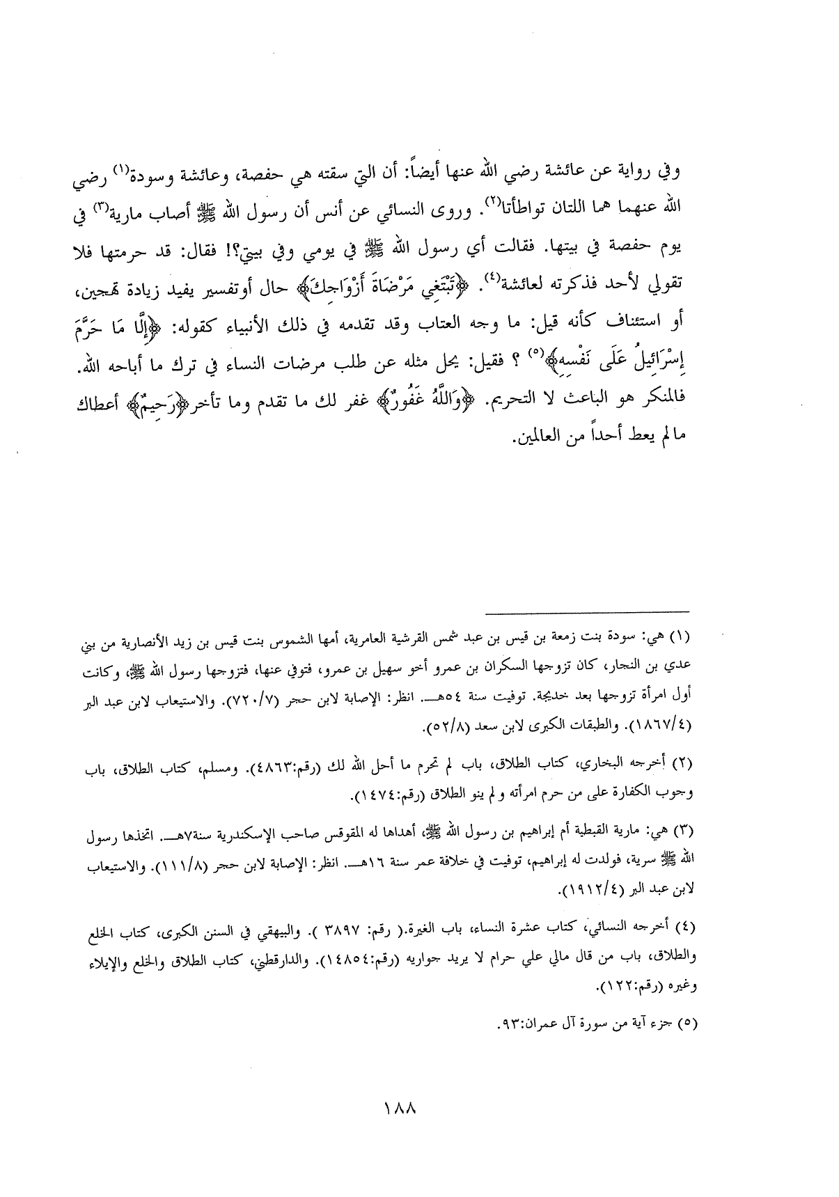 وفي رواية عن عائشة رضي اللَّه عنها أيضاً: أن التي سقته هي حفصة، وعائشة وسودة رضي اللَّه عنهما هما اللتان تواطأتا. وروى النسائي عن أنس أن رسول اللَّه - صلى الله عليه وسلم - أصاب مارية في يوم حفصة في بيتها. فقالت أي رسول اللَّه - صلى الله عليه وسلم - في يومي وفي بيتي؟! فقال: قد حرمتها فلا تقولي لأحد فذكرته لعائشة. (تَبْتَغِي مَرْضَاتَ أَزْوَاجِكَ) حال أو تفسير يفيد زيادة تهجين، أو استئناف كأنه قيل: ما وجه العتاب وقد تقدمه في ذلك الأنبياء كقوله: (إِلَّا مَا حَرَّمَ إِسْرَائِيلُ عَلَى نَفْسِهِ)؟ فقيل: يحل مثله عن طلب مرضات النساء في ترك ما أباحه اللَّه. فالمنكر هو الباعث لا التحريم. (وَاللَّهُ غَفُورٌ) غفر لك ما تقدم وما تأخر (رَحِيمٌ) أعطاك ما لم يعط أحداً من العالمين.