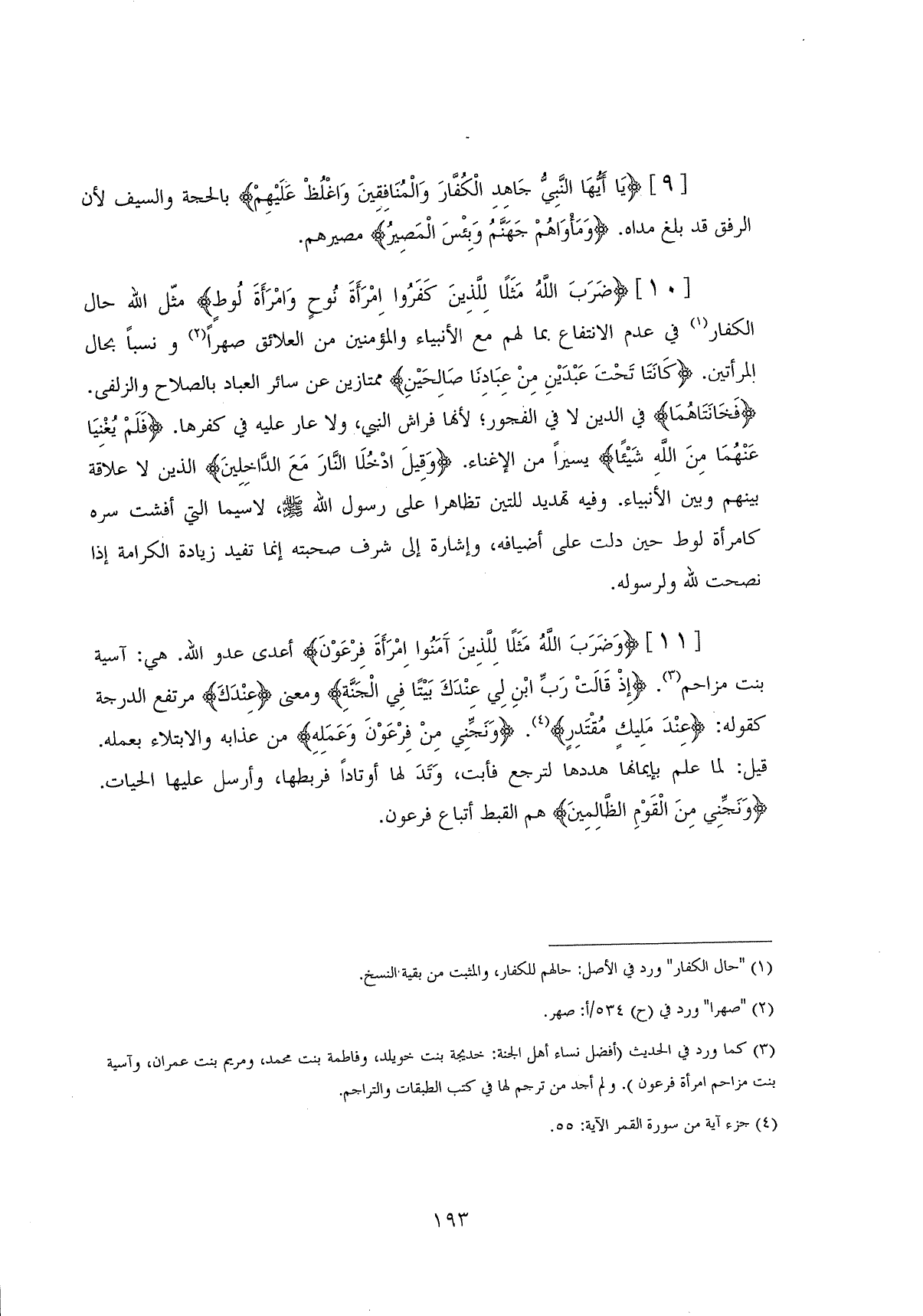 (ضَرَبَ اللَّهُ مَثَلًا لِلَّذِينَ كَفَرُوا امْرَأَتَ نُوحٍ وَامْرَأَتَ لُوطٍ ... (10) مثَّل اللَّه حال الكفار في عدم الانتفاع بما لهم مع الأنبياء والمؤمنين من العلائق صهراً ونسباً بحال المرأتين. (كَانَتَا تَحْتَ عَبْدَيْنِ مِنْ عِبَادِنَا صَالِحَيْنِ) ممتازين عن سائر العباد بالصلاح والزلفى.