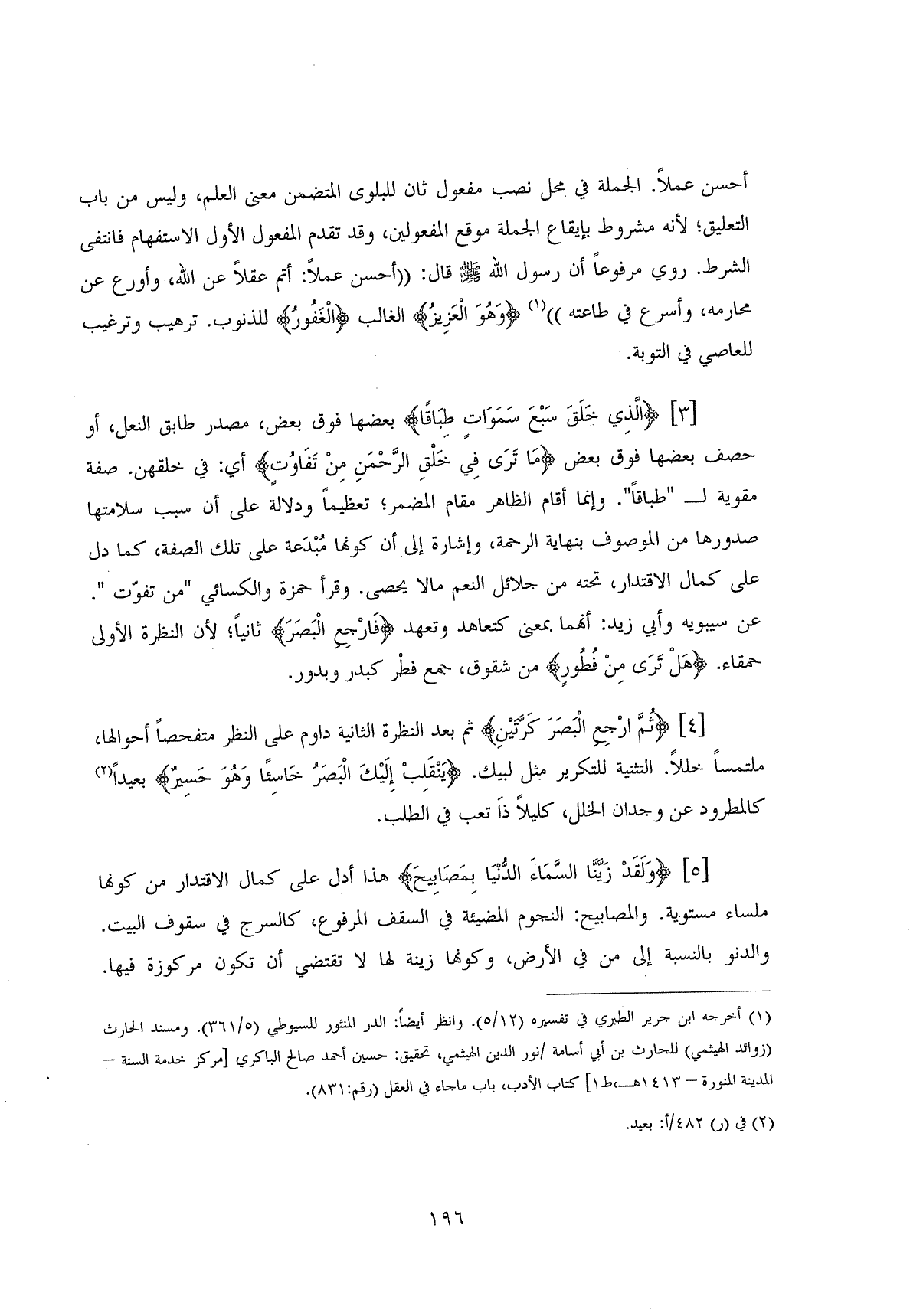 (ثُمَّ ارْجِعِ الْبَصَرَ كَرَّتَيْنِ ... (4) ثم بعد النظرة الثانية داوم على النظر متفحصاً أحوالها، ملتمساً خللاً. التثنية للتكرير مثل لبيك. (يَنْقَلِبْ إِلَيْكَ الْبَصَرُ خَاسِئًا وَهُوَ حَسِيرٌ) بعيداً كالمطرود عن وجدان الخلل، كليلاً ذا تعب في الطلب.
