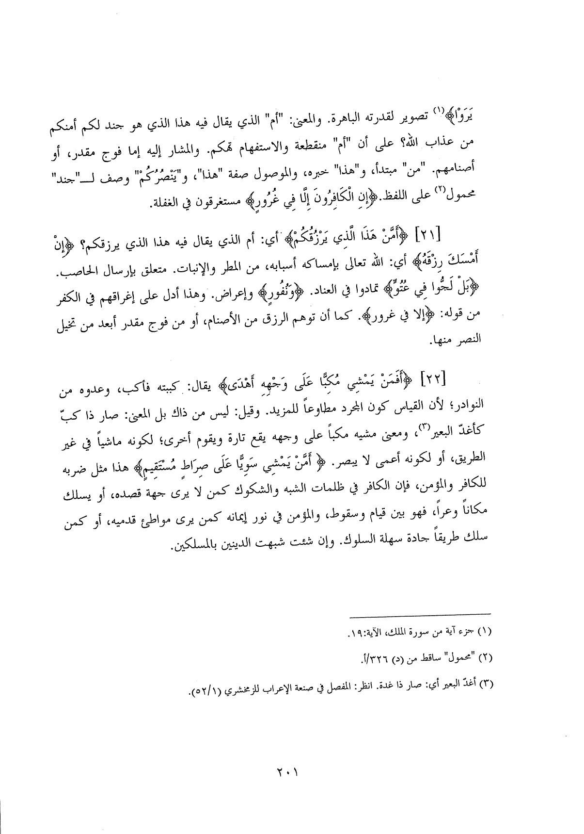 (أَفَمَنْ يَمْشِي مُكِبًّا عَلَى وَجْهِهِ أَهْدَى ... (22) يقال: كببته فأكب، وعدوه من النوادر؛ لأن القياس كون المجرد مطاوعاً للمزيد. وقيل: ليس من ذاك بل المعنى: صار ذا كبّ كأغدّ البعير، ومعنى مشيه مكباً على وجهه يقع تارة ويقوم أخرى؛ لكونه ماشياً في غير الطريق، أو لكونه أعمى لا يبصر. (أَمَّنْ يَمْشِي سَوِيًّا عَلَى صِرَاطٍ مُسْتَقِيمٍ) هذا مثل ضربه للكافر والمؤمن، فإن الكافر في ظلمات الشبه والشكوك كمن لا يرى جهة قصده، أو يسلك مكاناً وعراً، فهو بين قيام وسقوط، والمؤمن في نور إيمانه كمن يرى مواطئ قدميه، أو كمن سلك طريقاً جادة سهلة السلوك. وإن شئت شبهت الدينين بالمسلكين.