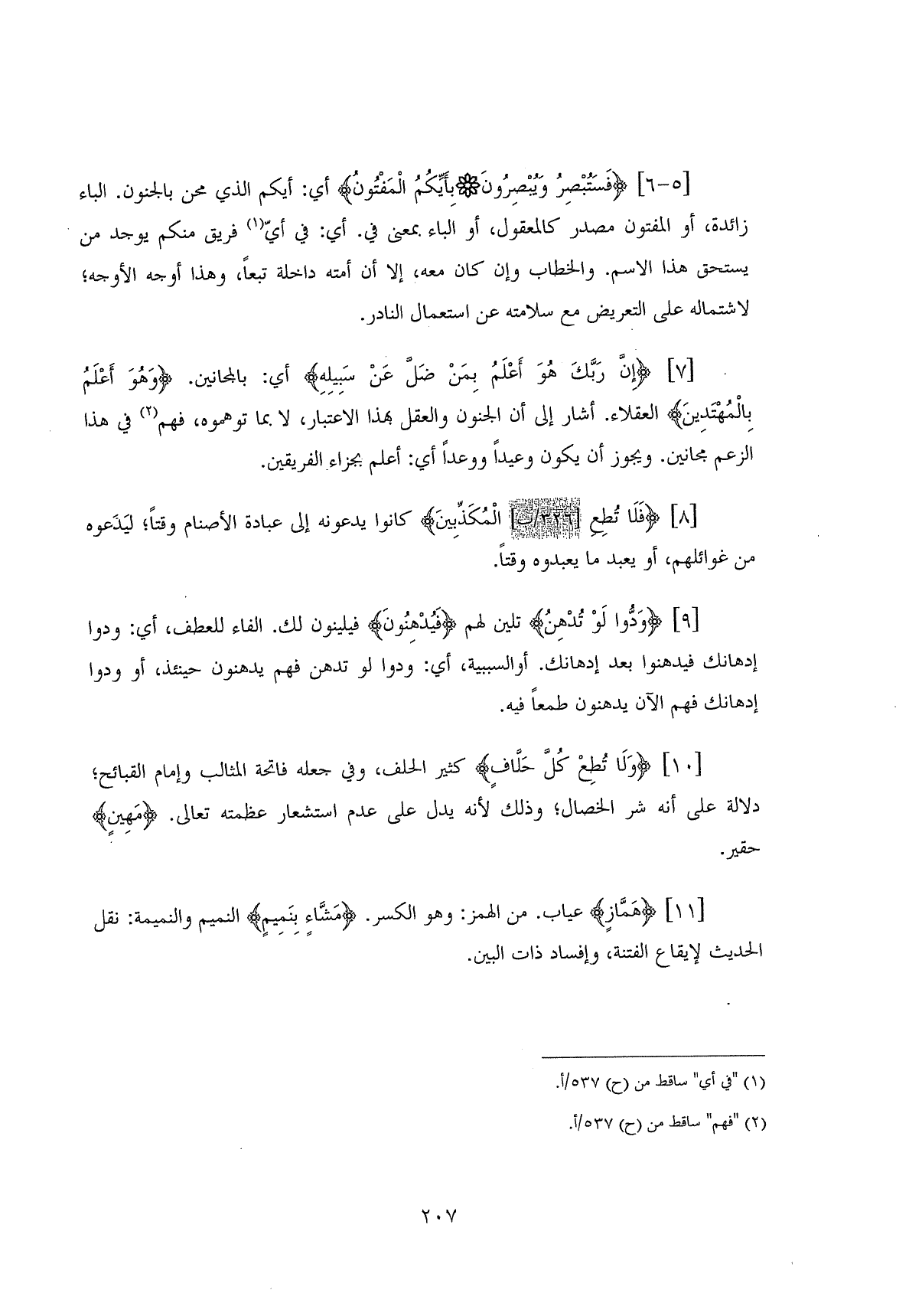 (فَسَتُبْصِرُ وَيُبْصِرُونَ (5) بِأَيِّكُمُ الْمَفْتُونُ (6) أي: أيكم الذي محن بالجنون. الباء زائدة، أو المفتون مصدر كالمعقول، أو الباء. بمعنى في. أي: في أيّ فريق منكم يوجد من يستحق هذا الاسم. والخطاب وإن كان معه، إلا أن أمته داخلة تبعاً، وهذا أوجه الأوجه؛ لاشتماله على التعريض مع سلامته عن استعمال النادر.