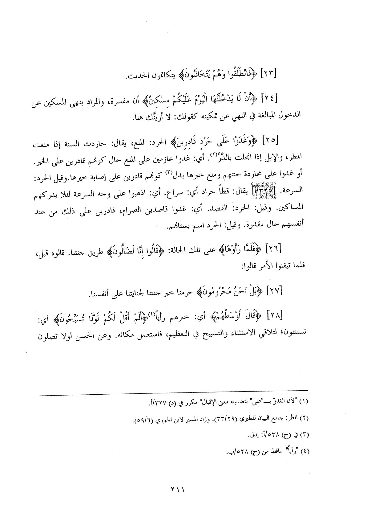 (وَغَدَوْا عَلَى حَرْدٍ قَادِرِينَ (25) الحرد: المنع، يقال: حاردت السنة إذا منعت المطر، والإبل إذا انجلت بالدَّرِّ، أي: غدوا عازمين على المنع حال كونهم قادرين على الخير. أو غدوا على محاردة جنتهم ومنع خيرها بدل كونهم قادرين على إصابة خيرها. وقيل الحرد: السرعة. يقال: قطاً حراد أي: سراع. أي: اذهبوا على وجه السرعة لئلا يدركهم المساكين. وقيل. الحرد: القصد. أي: غدوا قاصدين الصرام، قادرين على ذلك من عند أنفسهم حال مقدرة. وقيل: الحرد اسم بستانهم.
