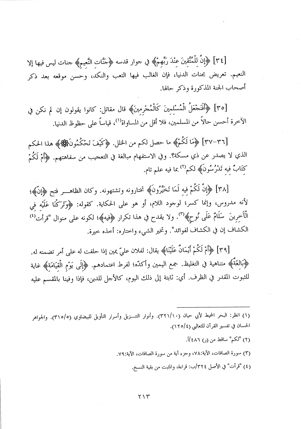 (أَفَنَجْعَلُ الْمُسْلِمِينَ كَالْمُجْرِمِينَ (35) قال مقاتل: كانوا يقولون إن لم نكن في الآخرة أحسن حالاً من المسلمين، فلا أقل من المساواة، قياساً على حظوظ الدنيا.