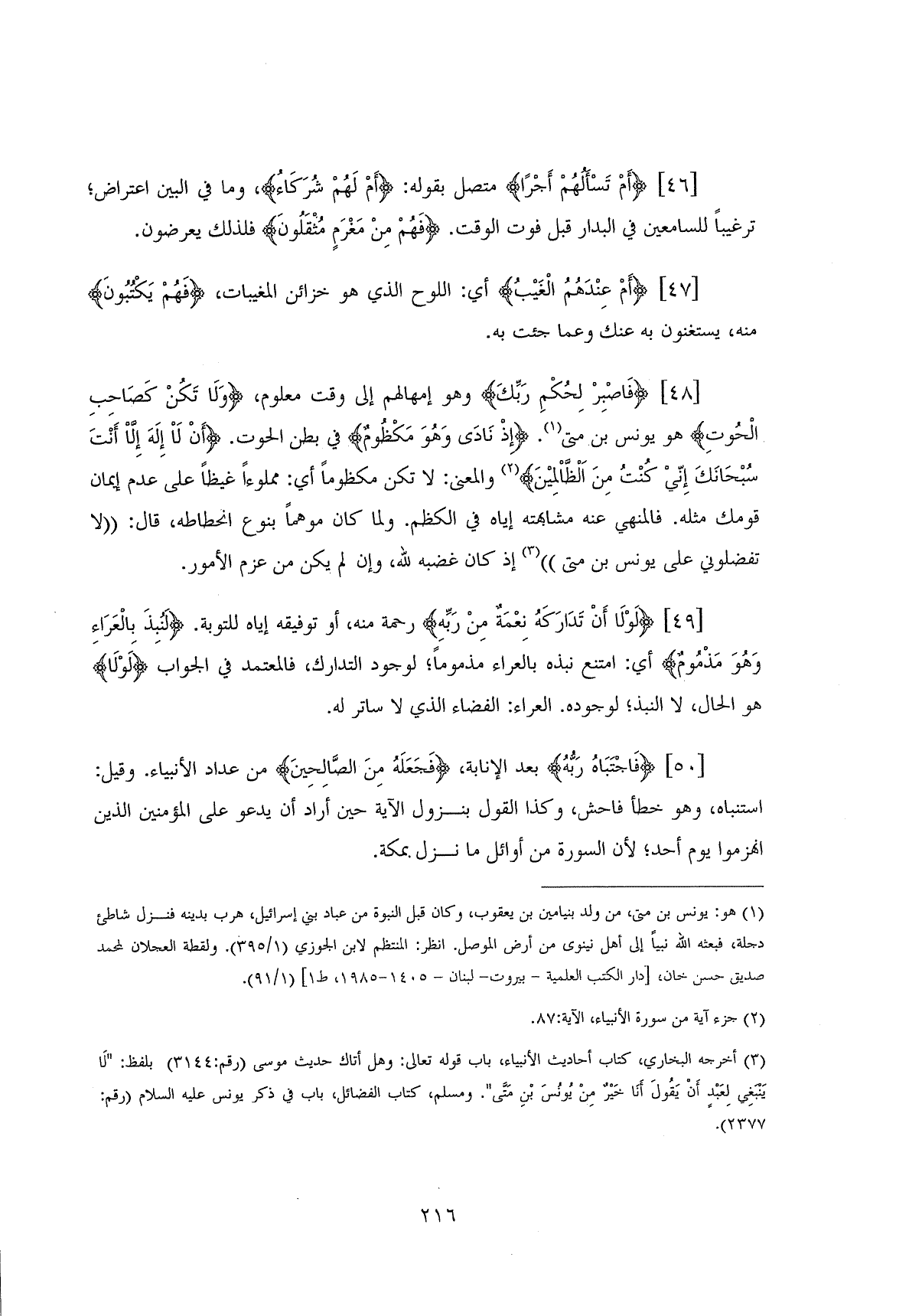 (فَاصْبِرْ لِحُكْمِ رَبِّكَ ... (48) وهو إمهالهم إلى وقت معلوم، (وَلَا تَكُنْ كَصَاحِبِ الْحُوتِ) هو يونس بن متى. (إِذْ نَادَى وَهُوَ مَكْظُومٌ) في بطن الحوت. (أَنْ لَا إِلَهَ إِلَّا أَنْتَ سُبْحَانَكَ إِنِّي كُنْتُ مِنَ الظَّالِمِينَ) والمعنى: لا تكن مكظوماً أي: مملوءاً غيظاً على عدم إيمان قومك مثله. فالمنهي عنه مشابهته إياه في الكظم. ولما كان موهماً بنوع انحطاطه، قال: " لا تفضلوني على يونس بن متَّى " إذ كان غضبه للَّه، وإن لم يكن من عزم الأمور.