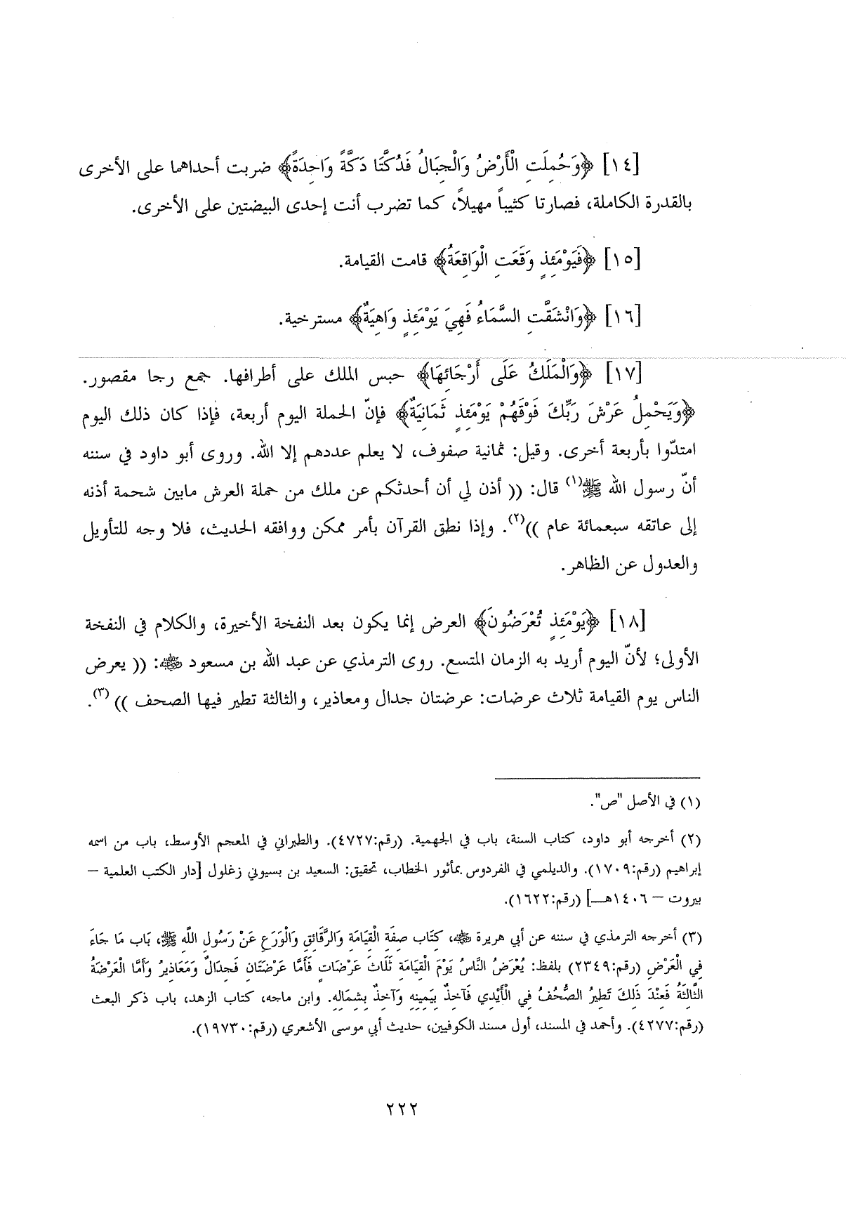 (وَالْمَلَكُ عَلَى أَرْجَائِهَا ... (17) حبس الملك على أطرافها. جمع رجا مقصور. (وَيَحْمِلُ عَرْشَ رَبِّكَ فَوْقَهُمْ يَوْمَئِذٍ ثَمَانِيَةٌ) فإنَّ الحملة اليوم أربعة، فإذا كان ذلك اليوم امتدّوا بأربعة أخرى. وقيل: ثمانية صفوف، لا يعلم عددهم إلا اللَّه. وروى أبو داود في سننه أنَّ رسول اللَّه - صلى الله عليه وسلم - قال: " أذن لي أن أحدثكم عن ملك من حملة العرش ما بين شحمة أذنه إلى عاتقه سبعمائة عام ". وإذا نطق القرآن بأمر ممكن ووافقه الحديث، فلا وجه للتأويل والعدول عن الظاهر.