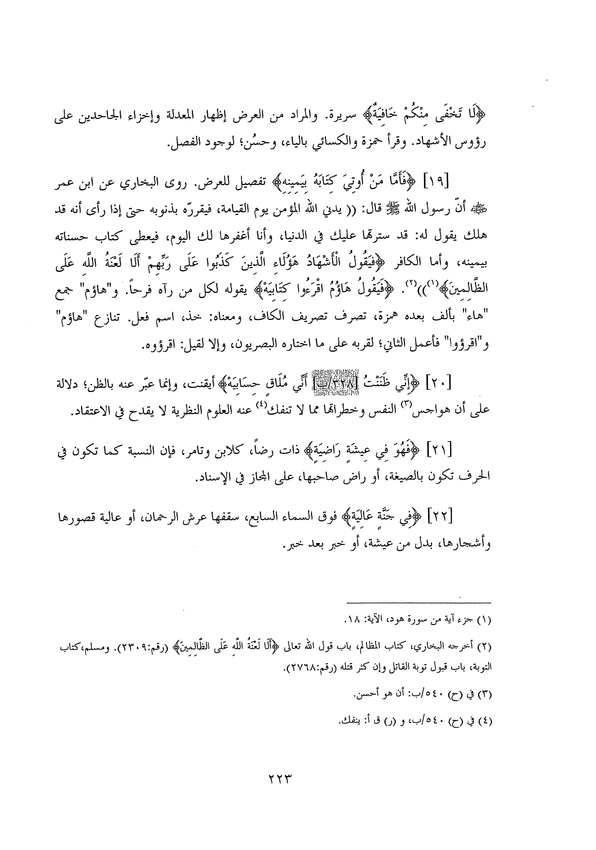 (فَأَمَّا مَنْ أُوتِيَ كِتَابَهُ بِيَمِينِهِ ... (19) تفصيل للعرض، روى البخاري عن ابن عمر - رضي الله عنهما - أنَّ رسول اللَّه - صلى الله عليه وسلم - قال: " يدني اللَّه المؤمن يوم القيامة، فيقرره بذنوبه حتى إذا رأي أنه قد هلك يقول له: قد سترتها عليك في الدنيا، وأنا أغفرها لك اليوم، فيعطى كتاب حسناته بيمينه، وأما الكافر فـ (يَقُولُ الْأَشْهَادُ هَؤُلَاءِ الَّذِينَ كَذَبُوا عَلَى رَبِّهِمْ أَلَا لَعْنَةُ اللَّهِ عَلَى الظَّالِمِينَ) ". (فَيَقُولُ هَاؤُمُ اقْرَءُوا كِتَابِيَهْ) بقوله لكل من رآه فرحاً. و " هاؤم " جمع " هاء " بألف بعده همزة، تصرف تصريف الكاف، ومعناه: خذ، اسم فعل. تنازع " هاؤم " و " اقرؤوا " فأعمل الثاني؛ لقربه على ما اختاره البصريون، وإلا لقيل: اقرؤوه.