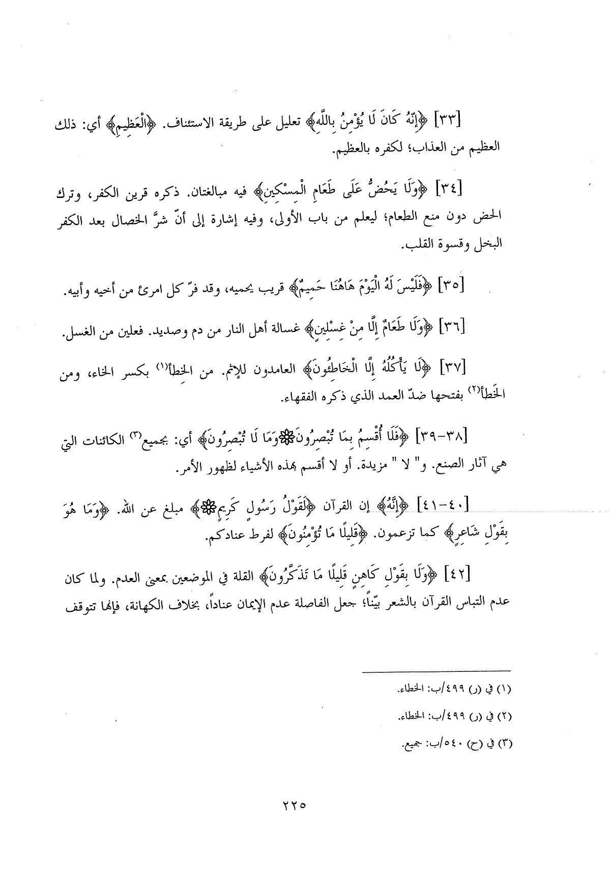(وَلَا يَحُضُّ عَلَى طَعَامِ الْمِسْكِينِ (34) فيه مبالغتان. ذكره قرين الكفر، وترك الحض دون منع الطعام؛ ليعلم من باب الأولى، وفيه إشارة إلى أنَّ شرَّ الخصال بعد الكفر البخل وقسوة القلب.
