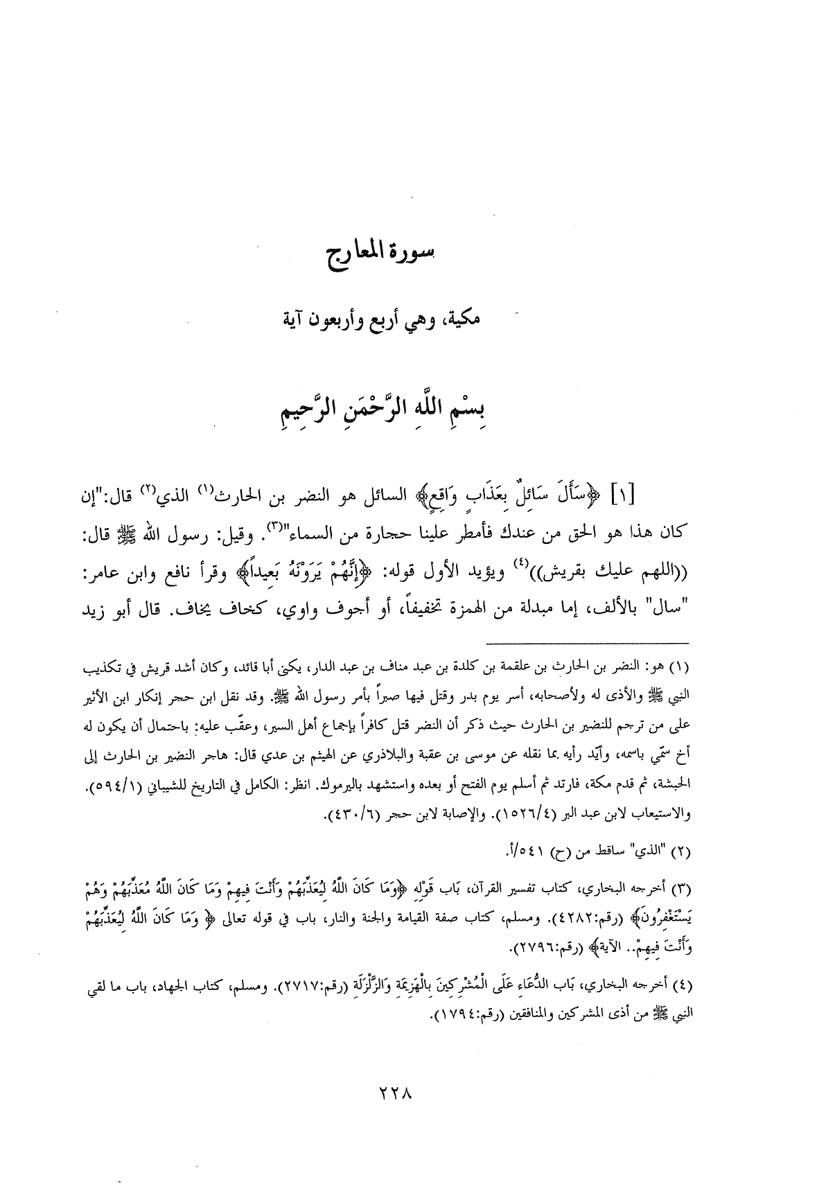 (سَأَلَ سَائِلٌ بِعَذَابٍ وَاقِعٍ (1) السائل هو النضر بن الحارث الذي قال: " إِنْ كَانَ هَذَا هُوَ الْحَقَّ مِنْ عِنْدِكَ فَأَمْطِرْ عَلَيْنَا حِجَارَةً مِنَ السَّمَاءِ ". وقيل: رسول اللَّه - صلى الله عليه وسلم - قال: " اللَّهم عليك بقريش " ويؤيد الأول قوله: (إِنَّهُمْ يَرَوْنَهُ بَعِيدًا) وقرأ نافع وابن عامر: " سال " بالألف، إما مبدلة من الهمزة تخفيفاً، أو أجوف واوي، كخاف يخاف. قال أبو زيد