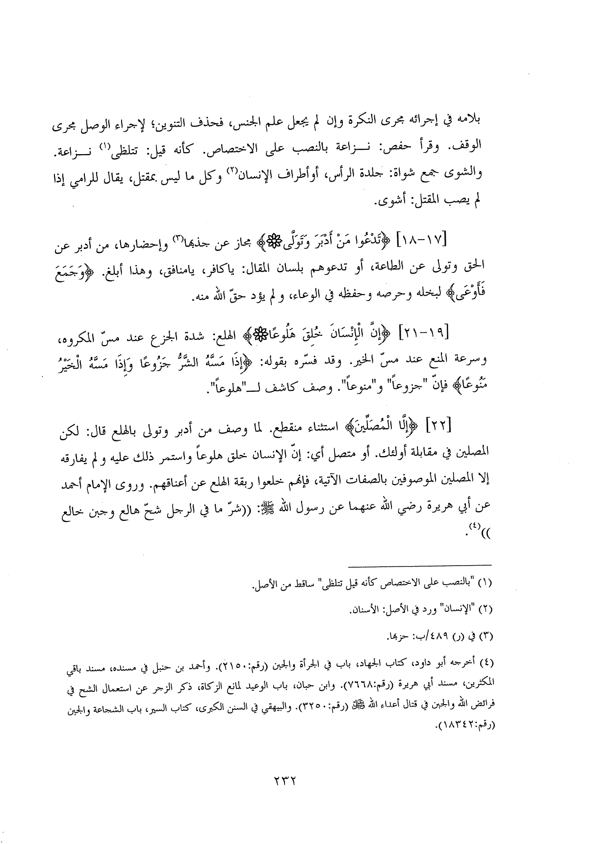 (إِلَّا الْمُصَلِّينَ (22) استثناء منقطع. لما وصف من أدبر وتولى بالهلع قال: لكن المصلين في مقابلة أولئك. أو متصل أي: إنَّ الإنسان خلق هلوعاً واستمر ذلك عليه ولم يفارقه إلا المصلين الموصوفين بالصفات الآتية، فإنهم خلعوا ربقة الهلع عن أعناقهم. وروى الإمام أحمد عن أبي هريرة رضي اللَّه عنهما عن رسول اللَّه - صلى الله عليه وسلم -: " شرّ ما في الرجل شحّ هالع وجن خالع ".